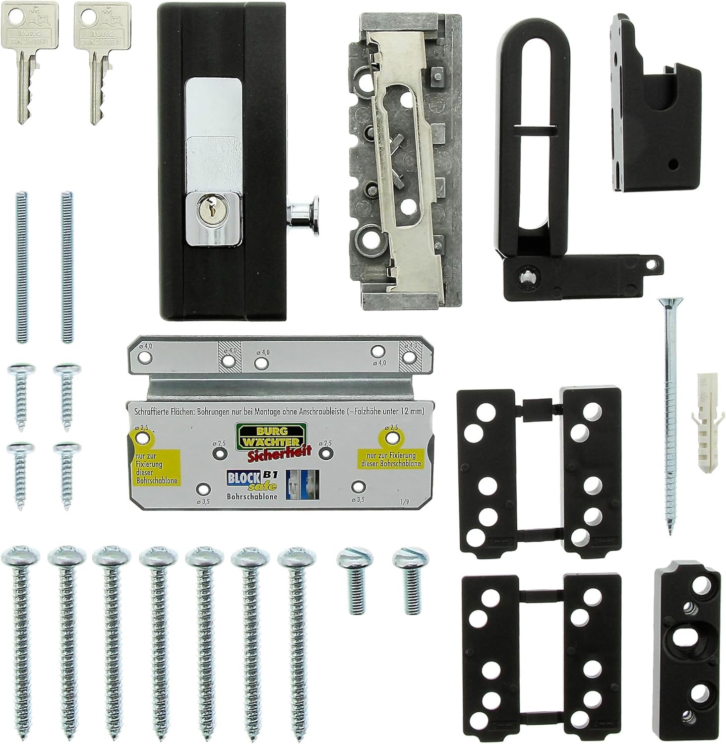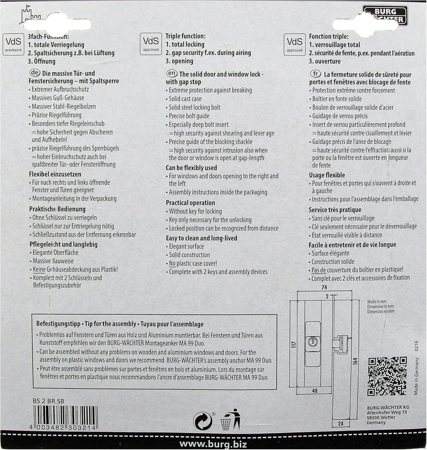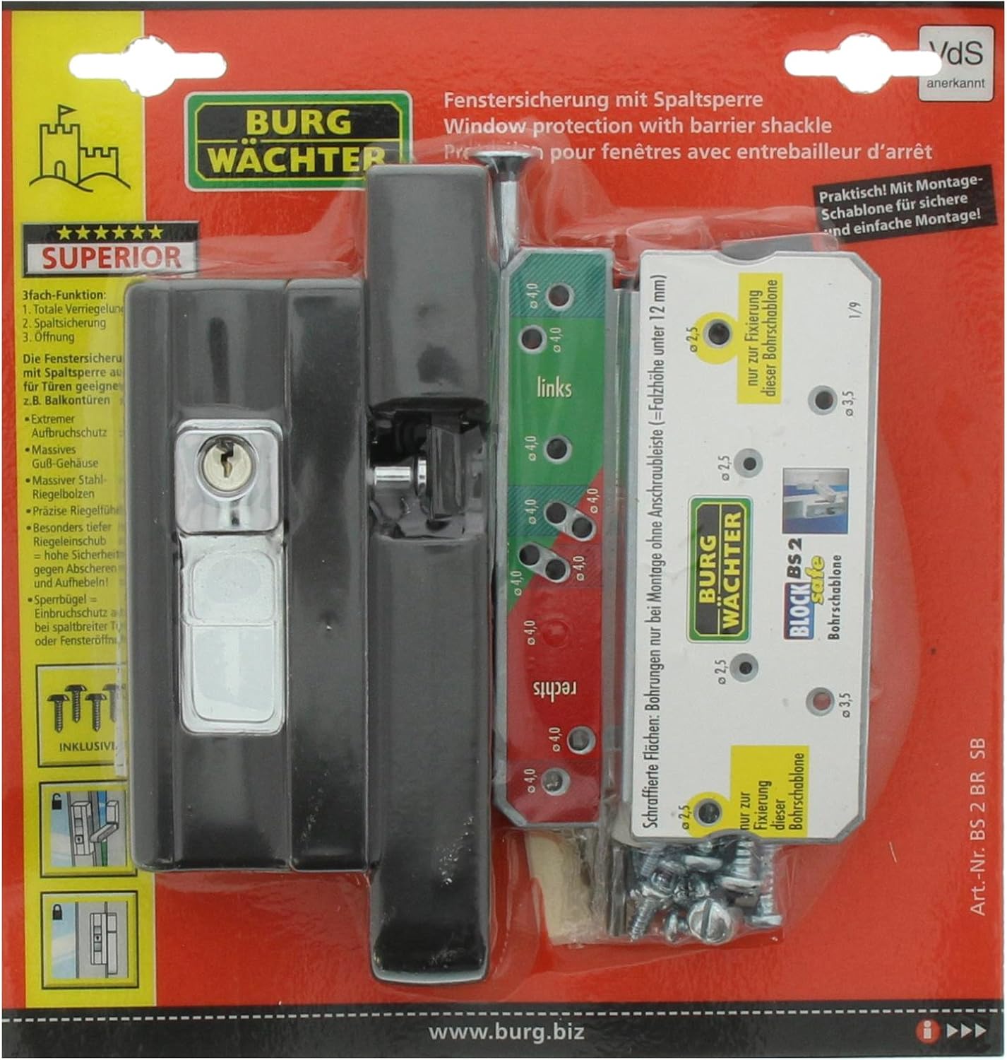 - LIEFERUMFANG & ABMESSUNGEN: 1 BURG-WÄCHTER Fenstersicherung, BlockSafe BS 2 BR, 2 Schlüssel, Befestigungsmaterial, Material: Stahl-Riegelbolzen mit Gehäuse aus Guss, Farbe: Graubraun