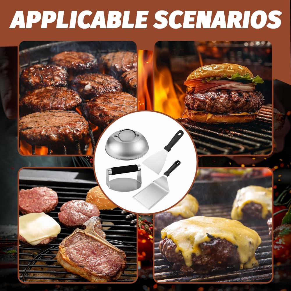 - 【Praktisches Design】 Das burger smasher set vierteilige Set enthält einen burger smasher und zwei grillspachtel. Das einzigartige Design mit dünner Klinge erleichtert das Aufnehmen von Zutaten. Die passende burgerglocke hat ein gebogenes