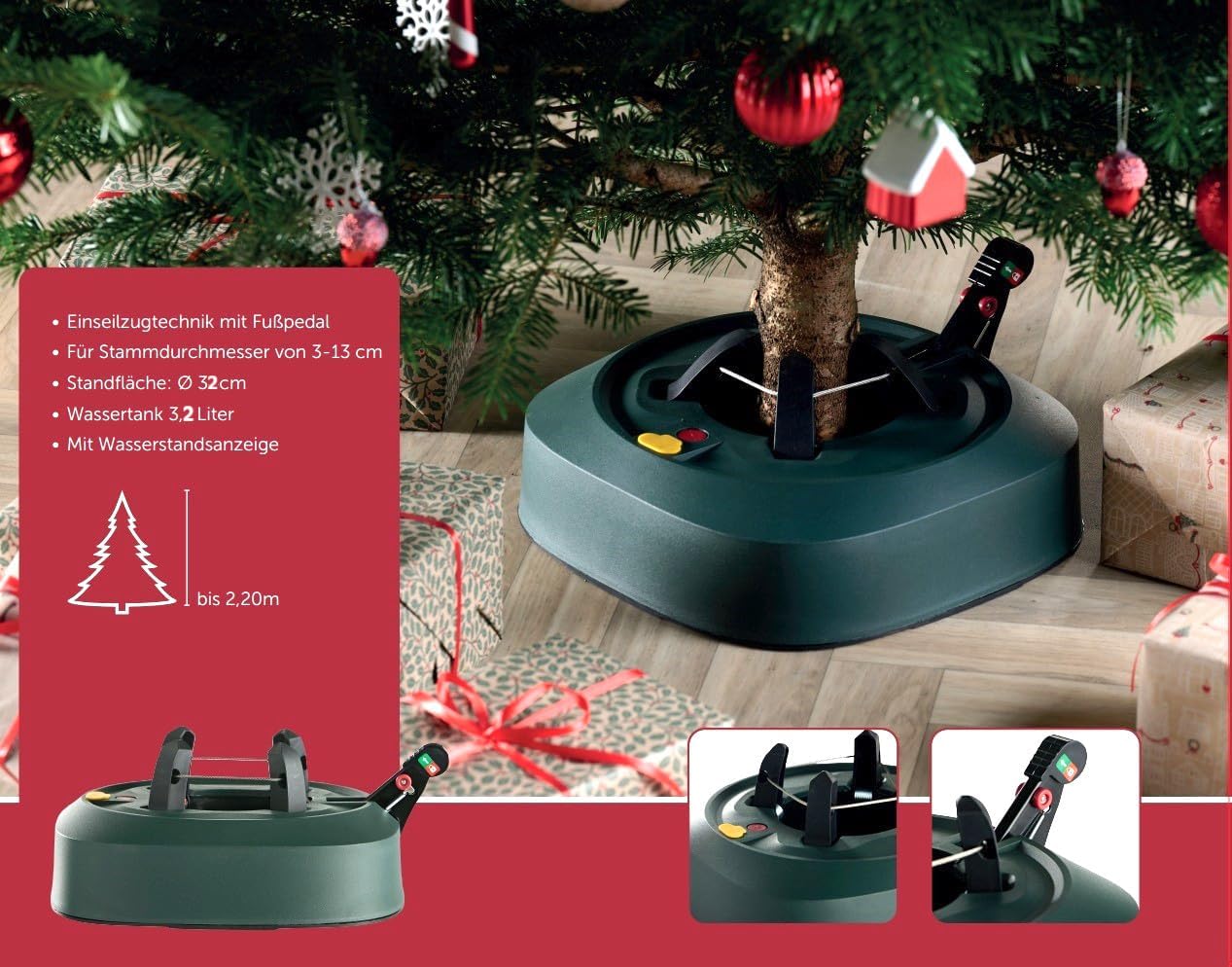 - DETAILS : Standfläche 32 cm / Gewicht 4 kg / geeignet für Tannenbäume bis 2,20 m / grosser Wassertank 3,2 Liter / mit Waserstandsanzeige / mit Fusshebel und Einrasttechnik