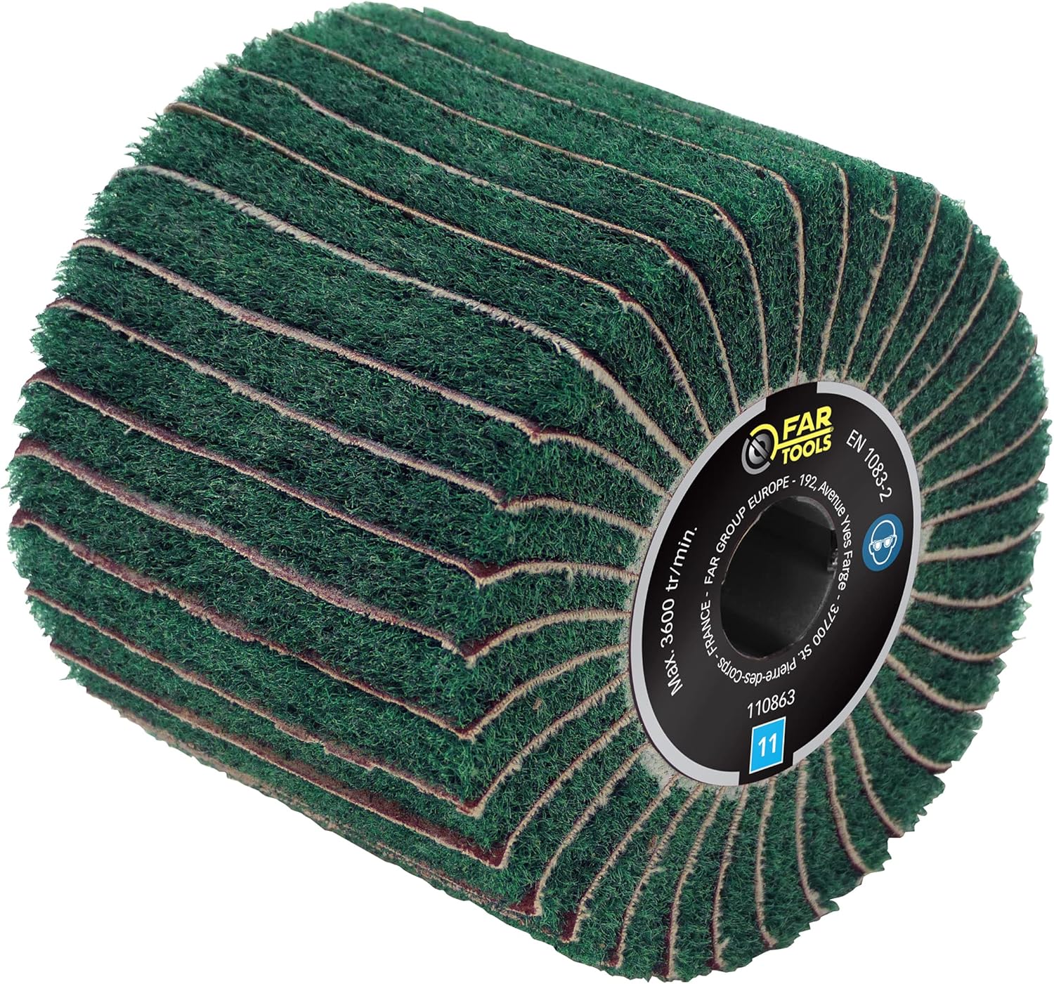 - Bürste aus Kunstfaser Körnung A240 und Schleiflamellen Körnung A120, 120 mm – L 100 mm zum Schleifen/Polieren/Satinieren von Holz oder Metall (komplexe oder ebene Oberflächen).
