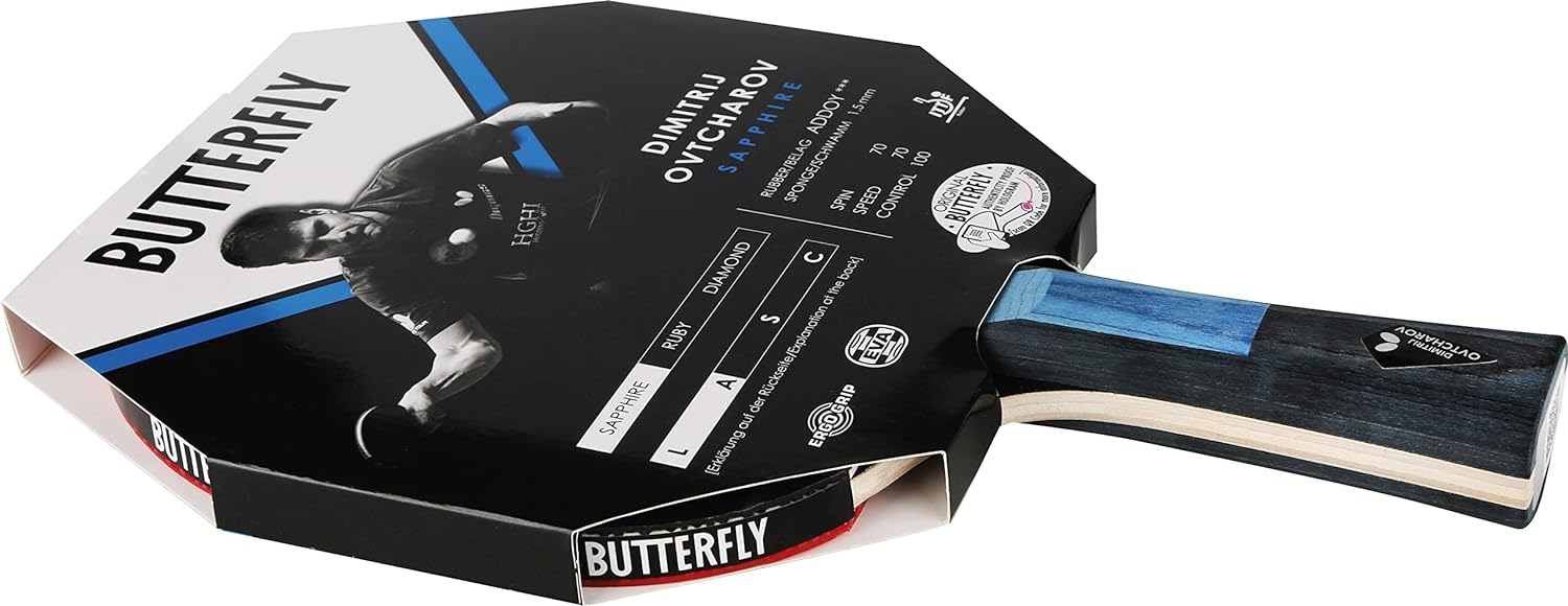 - Butterfly Dimitrij Ovtcharov SAPPHIRE Tischtennisschläger für Einsteiger und Fortgeschrittene mit den Werten: 70 % Spin/ 70 % Speed/ 100 % Control