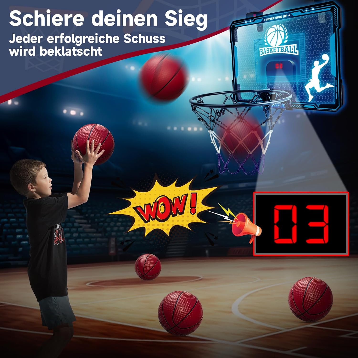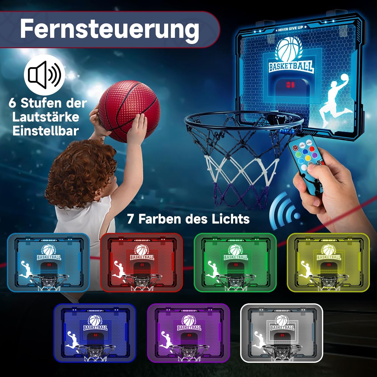 - 【7 Color Change Lights & Lectronic Scoring】-Feuern Sie Ihren Punktestand auch im Dunkeln an! Dieses basketballkorb indoor Set verfügt über 7 farbwechselnde LED-Leuchten und eine verbesserte elektronische Anzeigetafel, die Ihr Kind anfeuert und