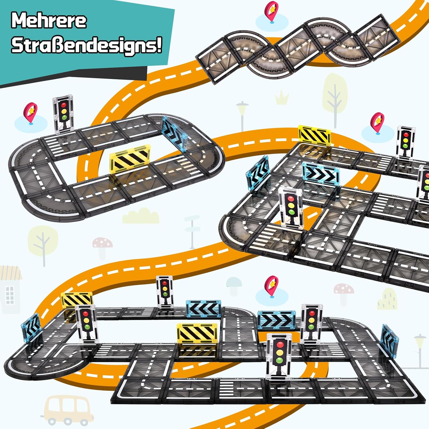 - đŁïžăEndlose Erkundungă: Unsere Magnetische Bausteine Strassenset verfĂŒgen ĂŒber ein bahnbrechendes Design mit geraden Strassen, Zebrastreifen und gewundenen Wegen, die Kinder leicht miteinander verbinden können, um verschiedene Strassenlayouts