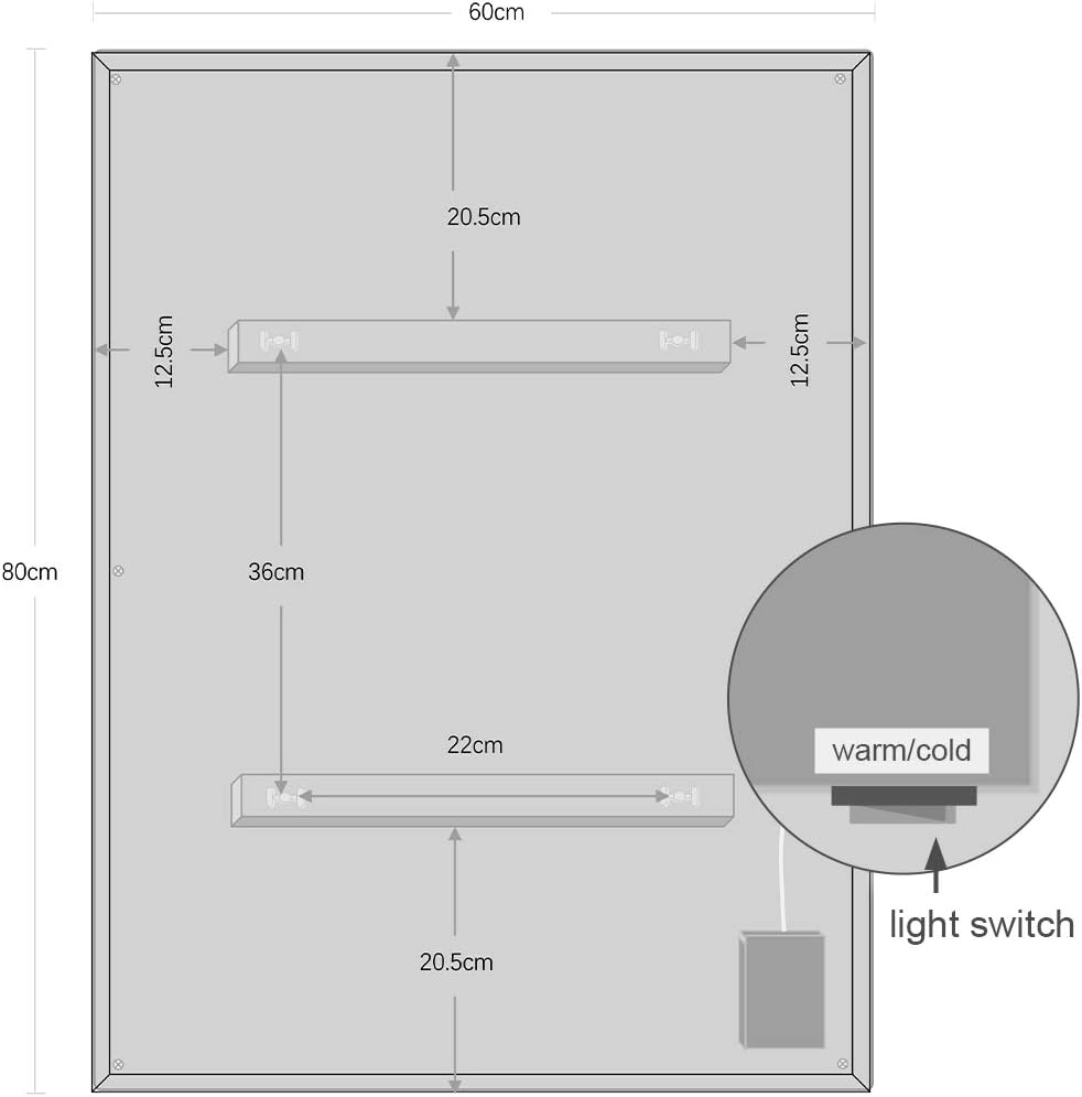 - 💎 LED-Beleuchtung - Drücken Sie den Schalter an der Anschlussdose auf der Rückseite des Spiegels, können Sie zwischen 3000K warmem Licht und 6000K weissem Licht wählen.