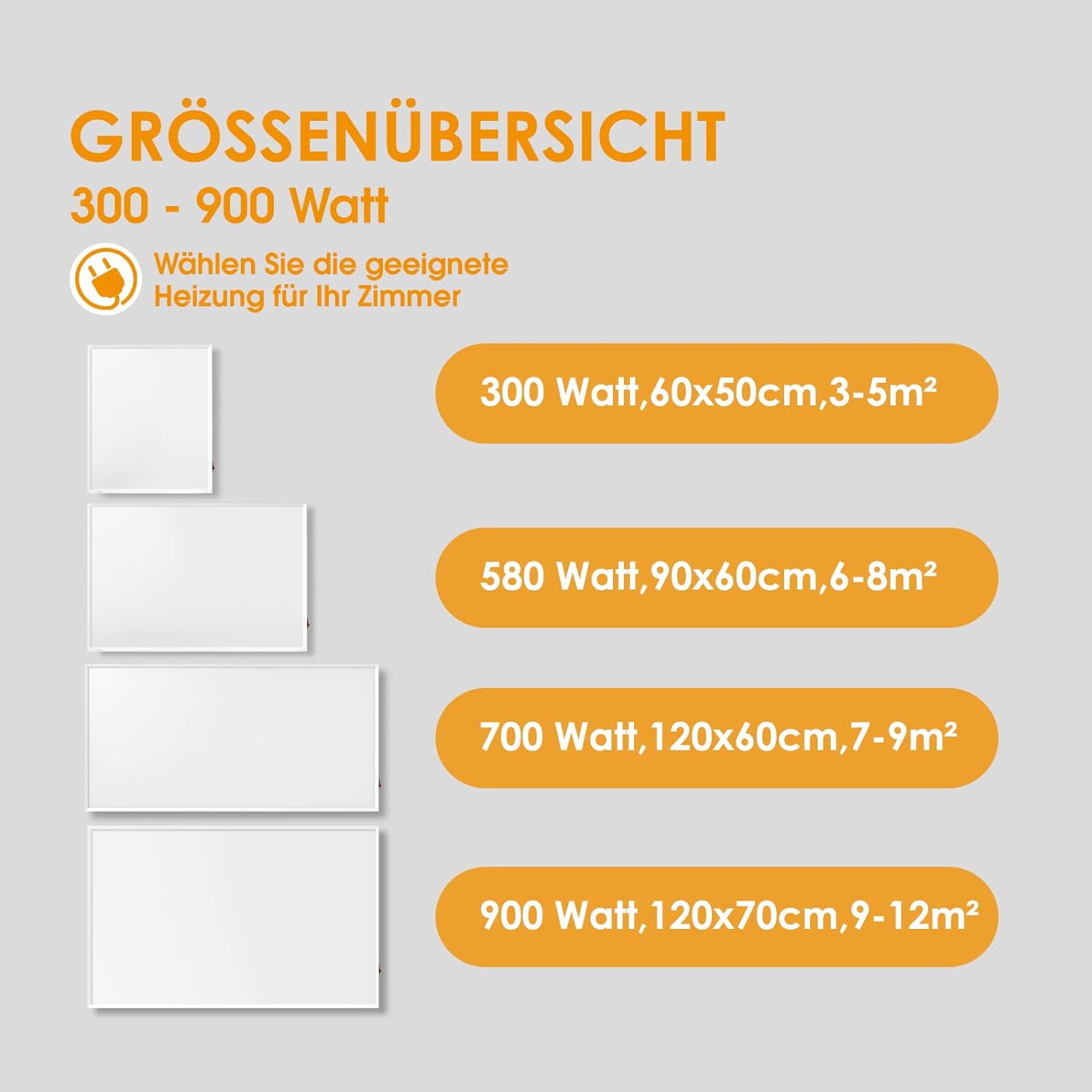 - [Gebrauchsanweisungen] - Wählen Sie eine oder mehrere Infrarot Heizplatten aus, die am besten zu Ihrem Raum passen -300 Watt 2-4㎡/580 Watt 6-8㎡/700 Watt 8-10 ㎡/900 Watt 10-13 ㎡. Infrarotheizung mit Thermostat kann bei Realisierung von Fernsteuerungs- und Energiesparzwecken helfen.