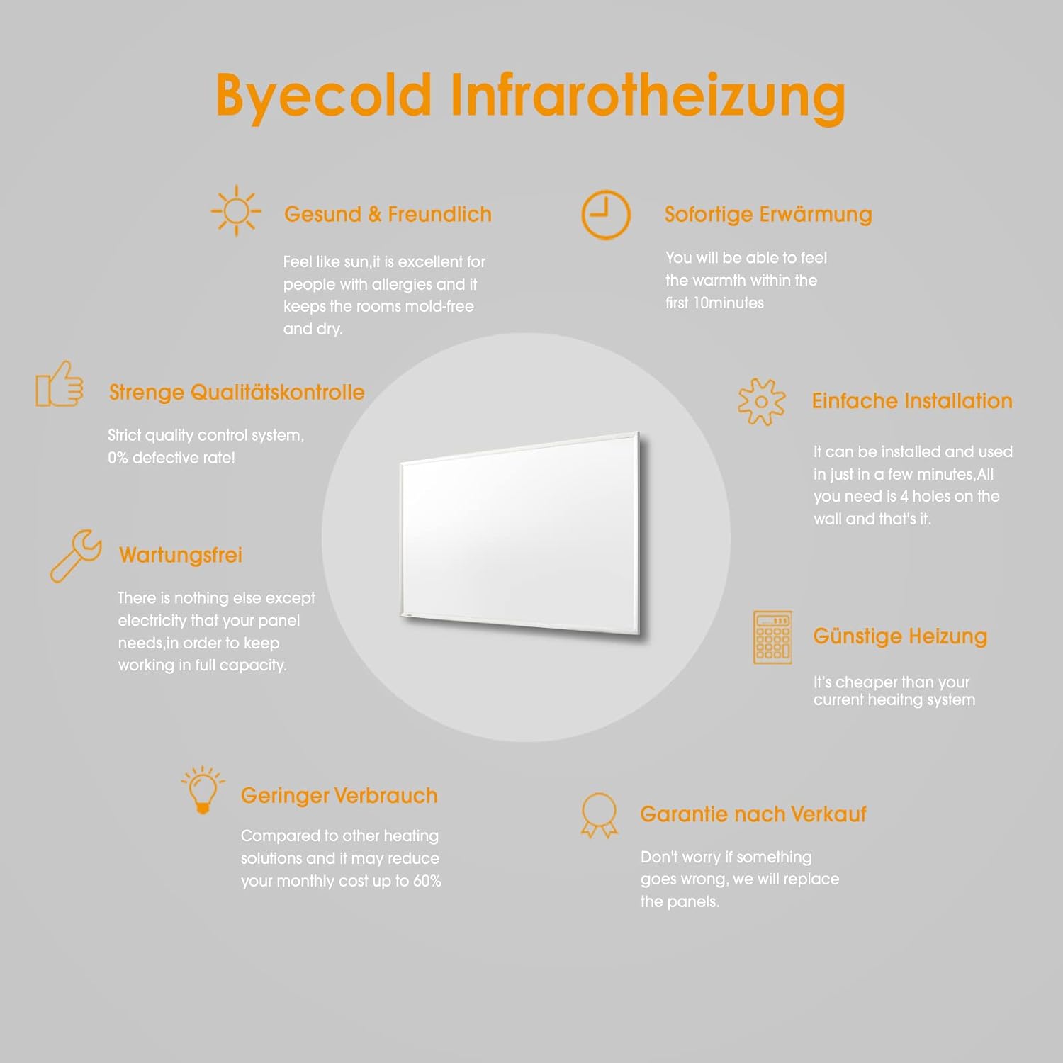 - [Infrarot-Technologie] - Dank der Byecold IR-Beschichtung ändert die Oberfläche der Infrarotheizkörper niemals die Farbe. Aufgrund des Heizprinzips des Infrarots erhitzt die elektrische Wandheizung Ihr Zimmer leise und gesund, kein Staub, keine seltsamen Gerüche oder Geräusche, nur wohlige Wärme.