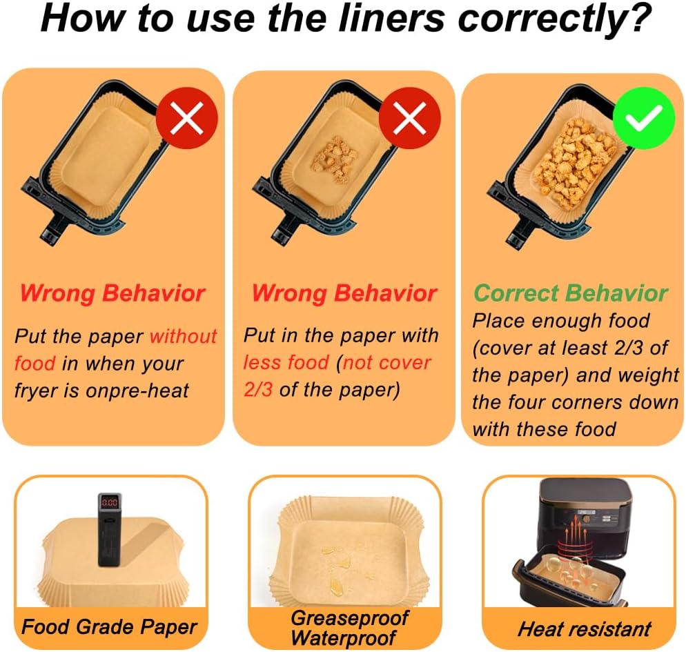 - Hochwertige Luftfritteusen-Papiereinlagen: Hergestellt aus 100 % lebensmittelechtem Zellstoff mit lebensmittelechter Antihaftbeschichtung, gesund, antihaftbeschichtet, fettdicht, wasserdicht, nicht saugfähig, 100 % sicher für den täglichen Gebrauch