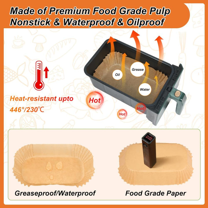- PREMIUM-LUFTFRITTEUSE-PAPIER-EINLAGEN: Hergestellt aus 100% lebensmittelechter Masse mit lebensmittelechter Antihaft-Beschichtung, gesund, antihaft, fettfest, wasserdicht, nicht absorbierend, 100% sicher für den täglichen Gebrauch