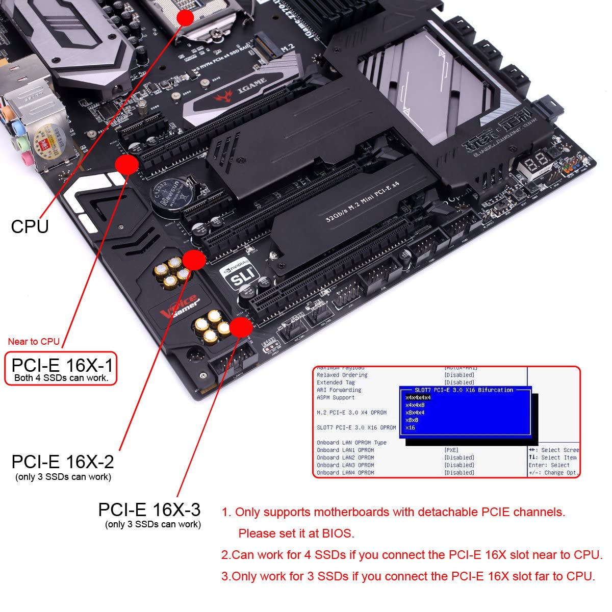 - 2. Unterstützt nur Motherboards mit abnehmbaren PCI-E-Kanälen. Steuern Sie den Betrieb von zwei Festplatten basierend auf dem PCIE-Kanal des Motherboards. Das Motherboard ohne PCIE-Signalspaltung kann nur eine Festplatte erkennen.
