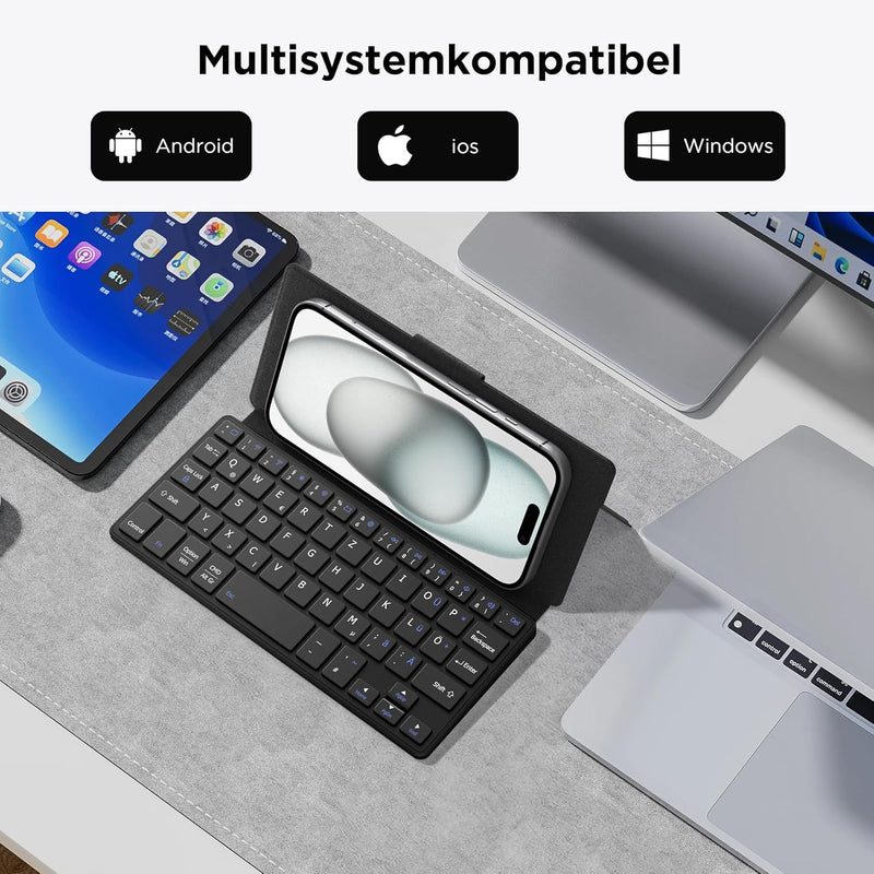 - 【Klappbare QWERTZ Handy-Tastatur】 Diese bluetooth mini klappbare QWERTZ Handy-Tastatur verwendet ein Brieftaschenstil mit Verstellbarer Ständer für flexible Betrachtungswinkel. design. Nach dem Zusammenklappen hat sie eine schlanke Form (190* 85*15