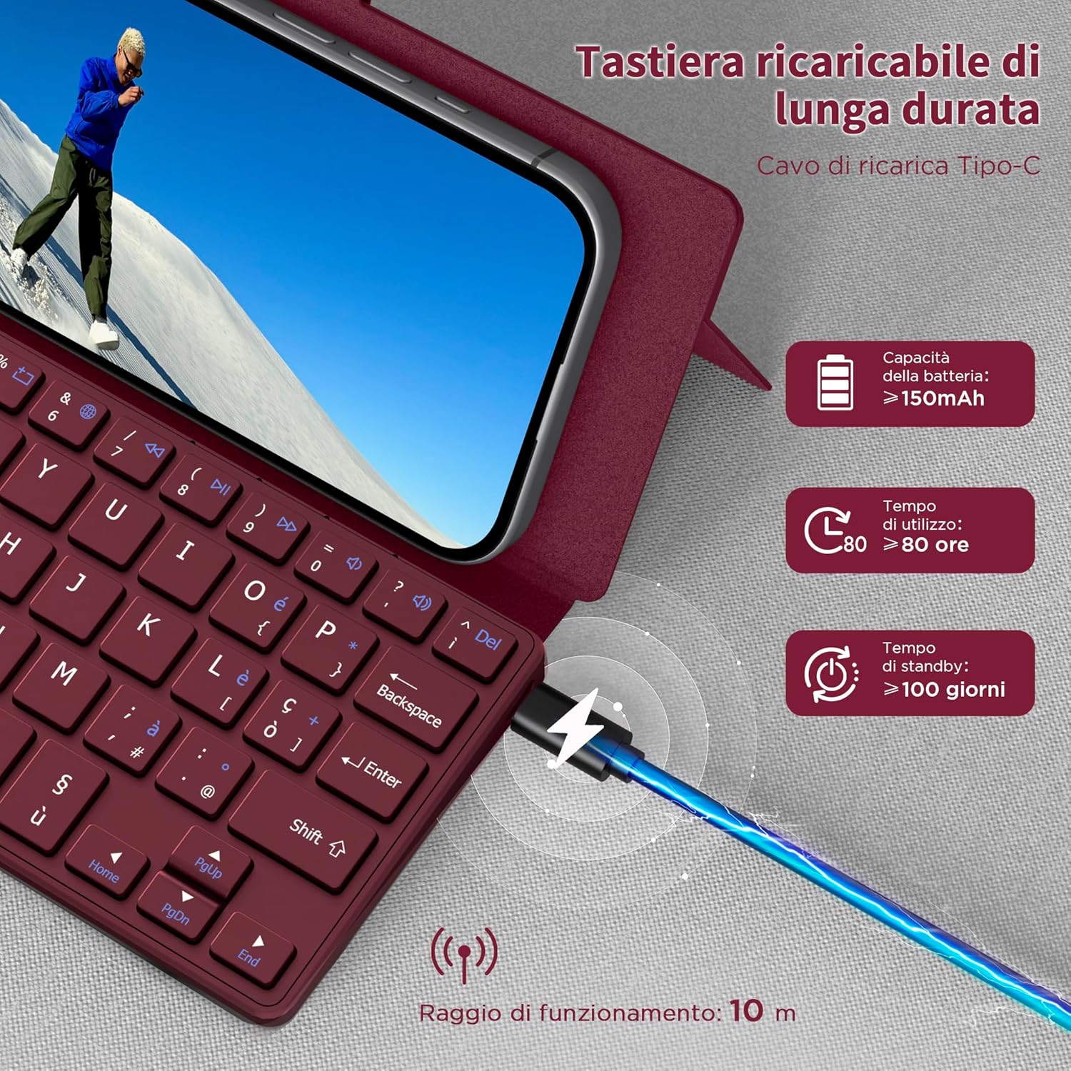 - 【Bluetooth Faltbare Tastatur mit Ständer】Diese ultradünne, tragbare, faltbare Tastatur wiegt nur 191 Gramm. Zusammengeklappt ist die Mini-Tastatur nur so gross wie ein Handy, leicht und tragbar, kann in eine Hosentasche oder einen Rucksack gefaltet