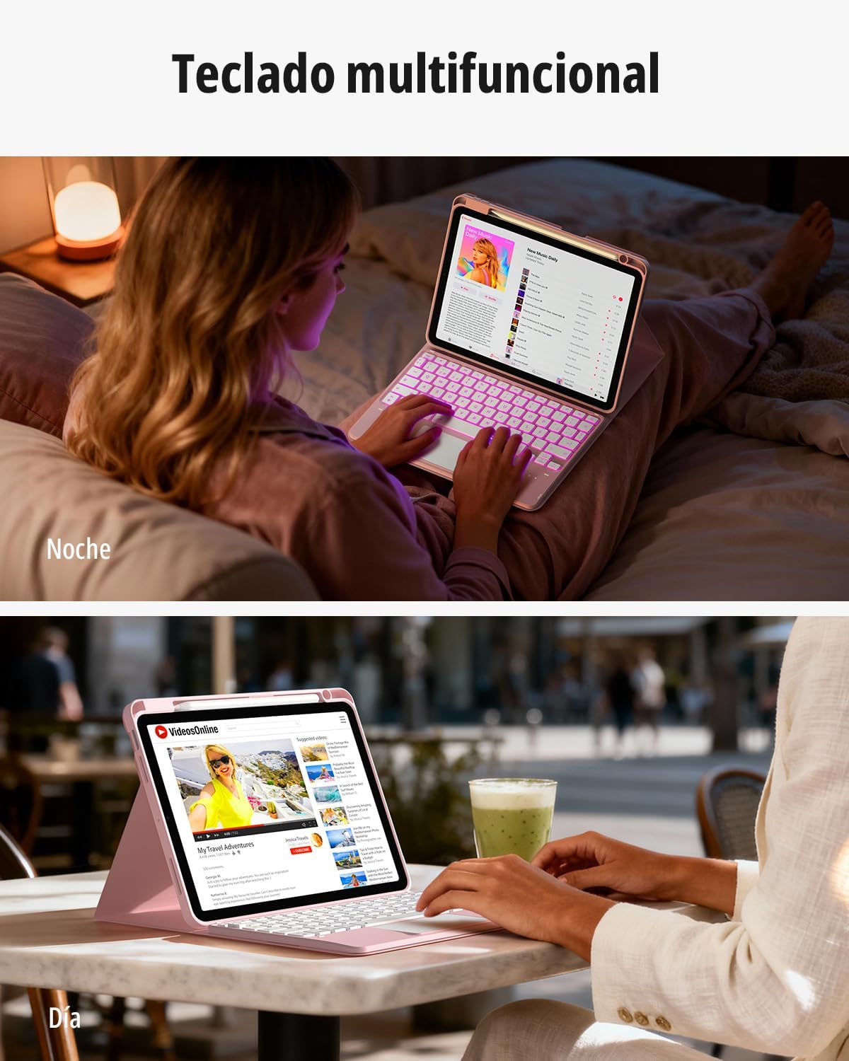 - Teclado con iluminación colorida: Cambia fácilmente entre 7 hermosos colores y 3 niveles de brillo. Puedes usar el teclado del iPad fácilmente en condiciones de poca luz. Disfruta de una experiencia visual única y una escritura cómoda