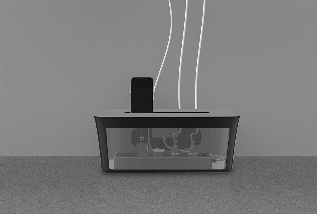 - Kabelbox mit Ladesteckplatz im Deckel • Grosse Öffnung auf der Rückseite: für einfaches Ein- und Ausstecken, ohne den Deckel öffnen zu müssen • Oberflächenschonende Schaumstoff-Füsse für sicheren Stand