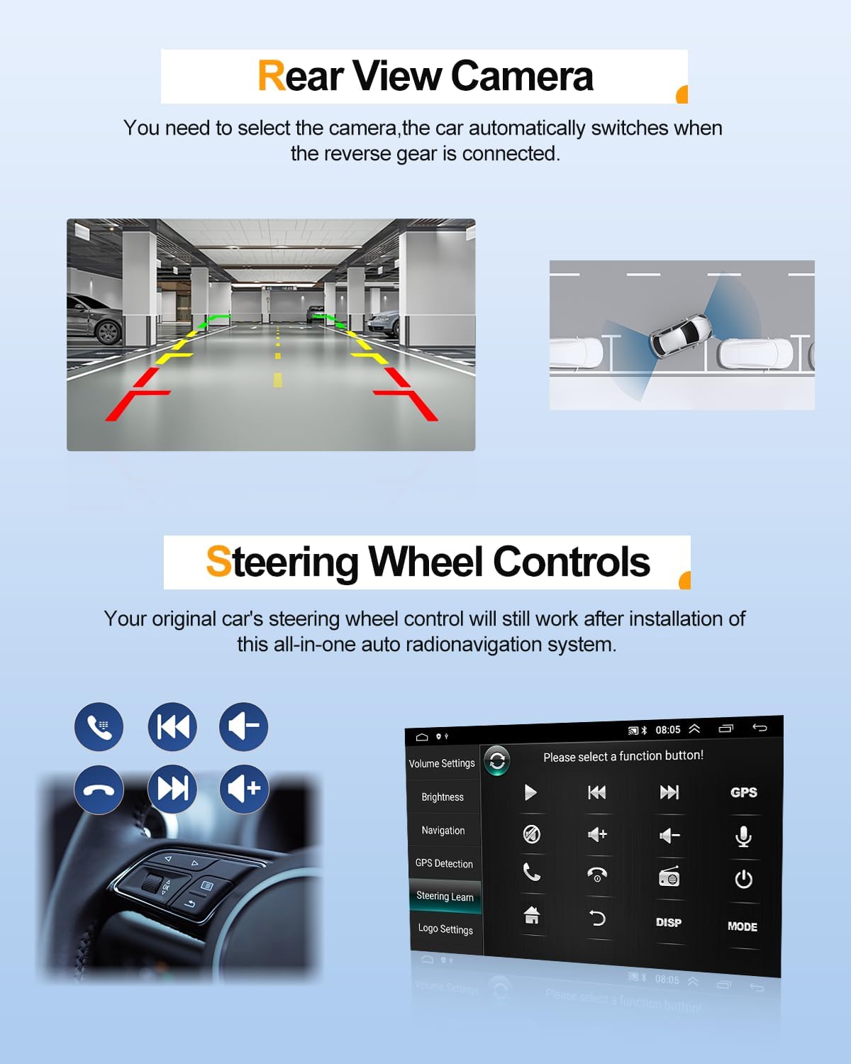 • 🌟【Weitere Funktionen】 1) Autoradio mit AHD-Rückfahrkamera, breiter Betrachtungswinkel, hoher wasserdichter Koeffizient, gute Nachtsicht, so dass Sie ein klares Bild in jeder Umgebung erhalten können. 2) Unterstützen Sie externe OBD2, DAB+,