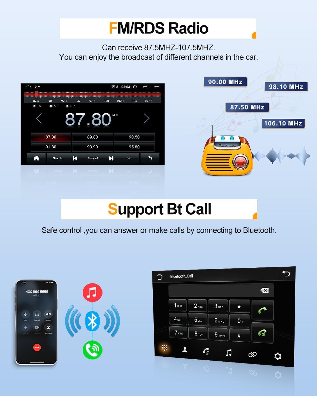 • 🎶【Autoradio mit Bluetooth und FM/RDS】Support Bluetooth Freisprechfunktion, automatische Telefonbuchladung und Musikwiedergabe.FM/RDS-Funktion mit 18 voreingestellten Radiosendern, starke Rauschunterdrückung und Anti-Interferenz-Funktion. Klicken