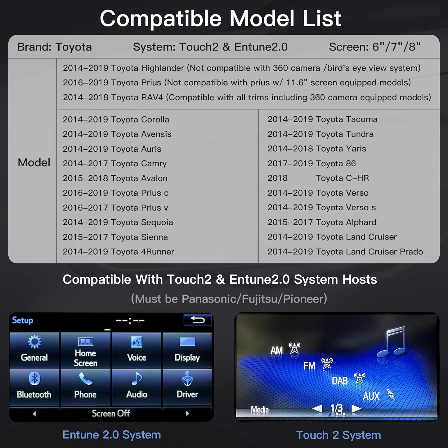 - 【Hinweis!!】Nur passend für kompatibel für Toyota 2014-2019 mit Touch2 & Entune2.0.(Bitte beachten Sie die kompatiblen Modelle der Fahrzeuge auf den Bildern)