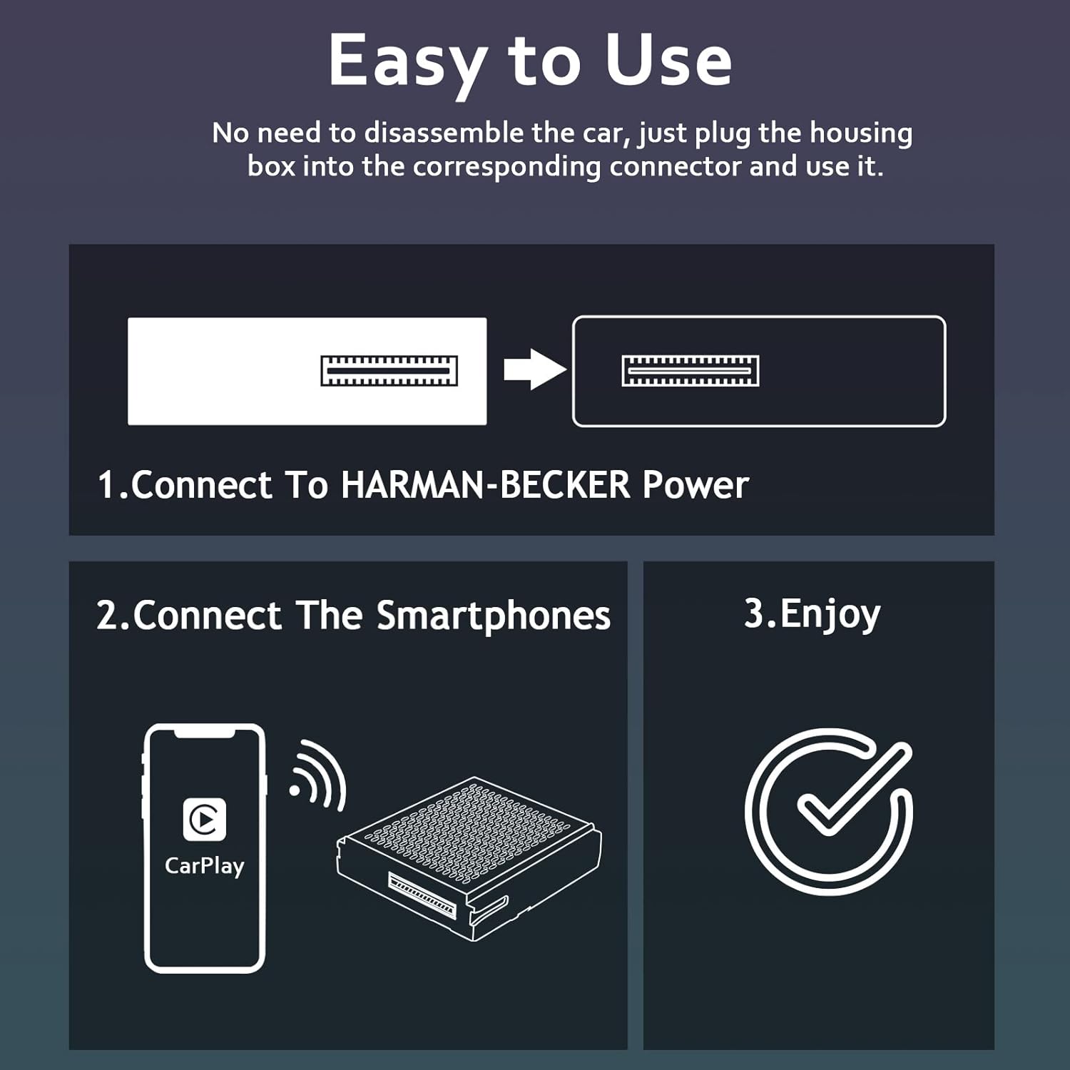 - 🚘【Easy To Use】Simply align and plug into the HARMAN-BECKER socket. Es wird die CarPlay-Funktion freischalten. Keine Notwendigkeit, das Auto zu demontieren und eine Fehlfunktion des Autos aufgrund von Bedienungsfehlern zu vermeiden.