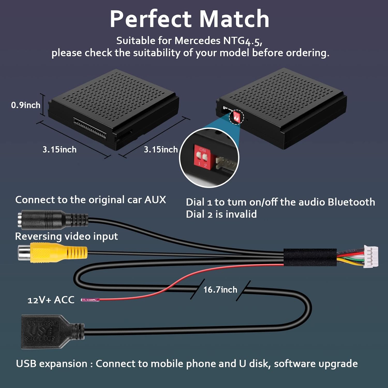 - 🚘【ImPORTANT NOTE】Be sure to check if your glove box has a module slot before purchasing. If your glove box does not have a module slot, it will not work even if your model is included in the adapter table!!! This Carplay Wireless Adapter is compatible for 2011-2016 Mercedes Benz A/B/C/E/CLA/GLA/GLK/ML/SLD NTG4.5 system with HARMAN BECKER slot. If your audio has no sound, please do the Bluetooth connection audio setting. Translated with www.DeepL.com/Translator (free version)