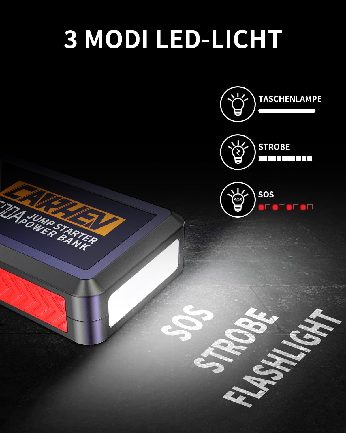 - 【MEHR ALS NUR EIN STARTHILFE】Das CARHEV Autostarter dient auch als tragbare 26800mAh Powerbank mit 2 USB Ausgängen (9V/2A und 5V/2A). Sie können Telefon, Tablets, Kopfhörer und andere USB Geräte aufladen. Eingebaute LED Licht mit 3 Modi