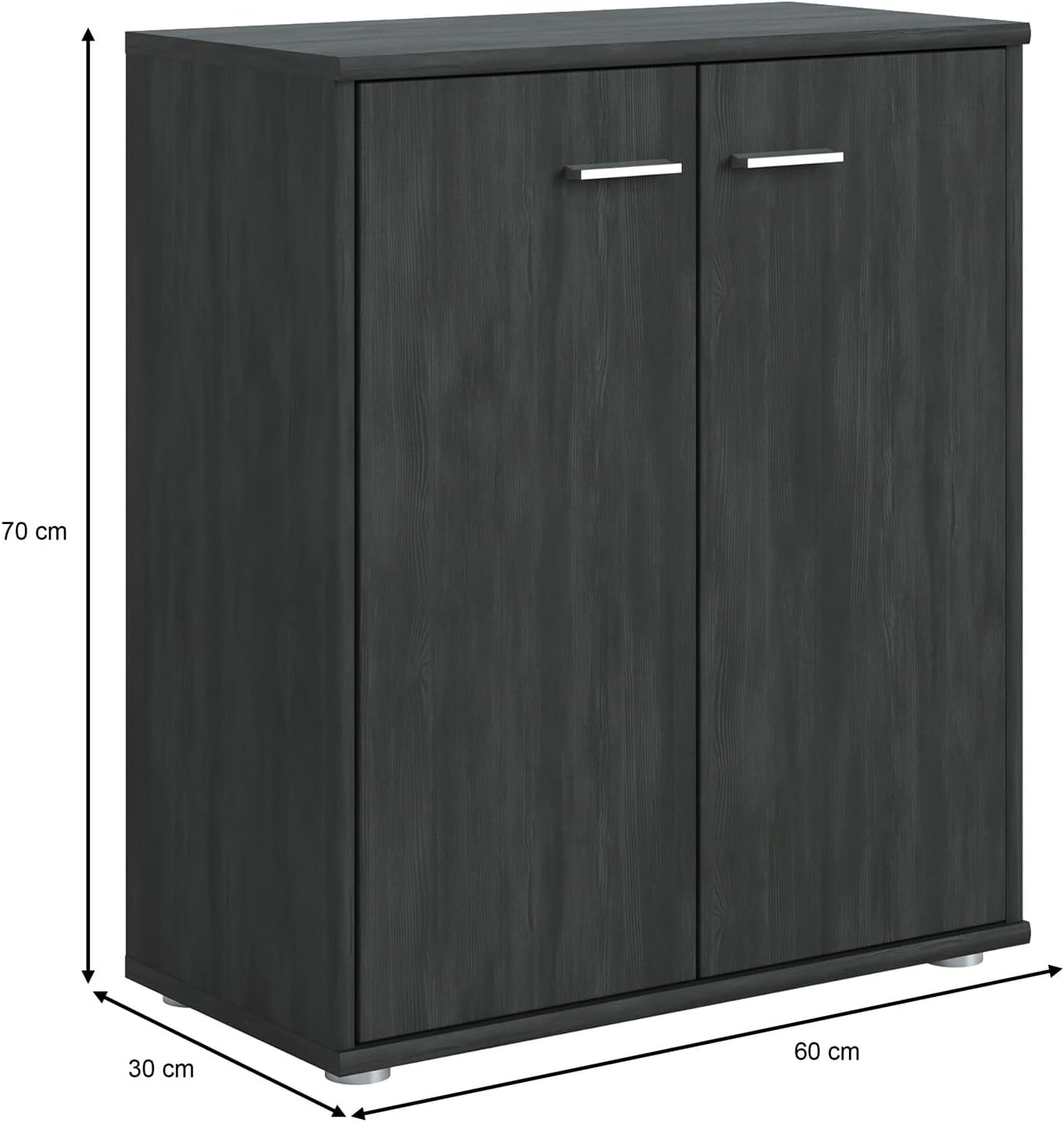 - Der enthaltene Einlegeboden teilt die Fläche hinter den Türen in zwei Hälften. Masse jeweils zwischen dem Einlegeboden oben und unten: 56,7 x 28,6 x 29,3 cm (Breite x Höhe x Tiefe)