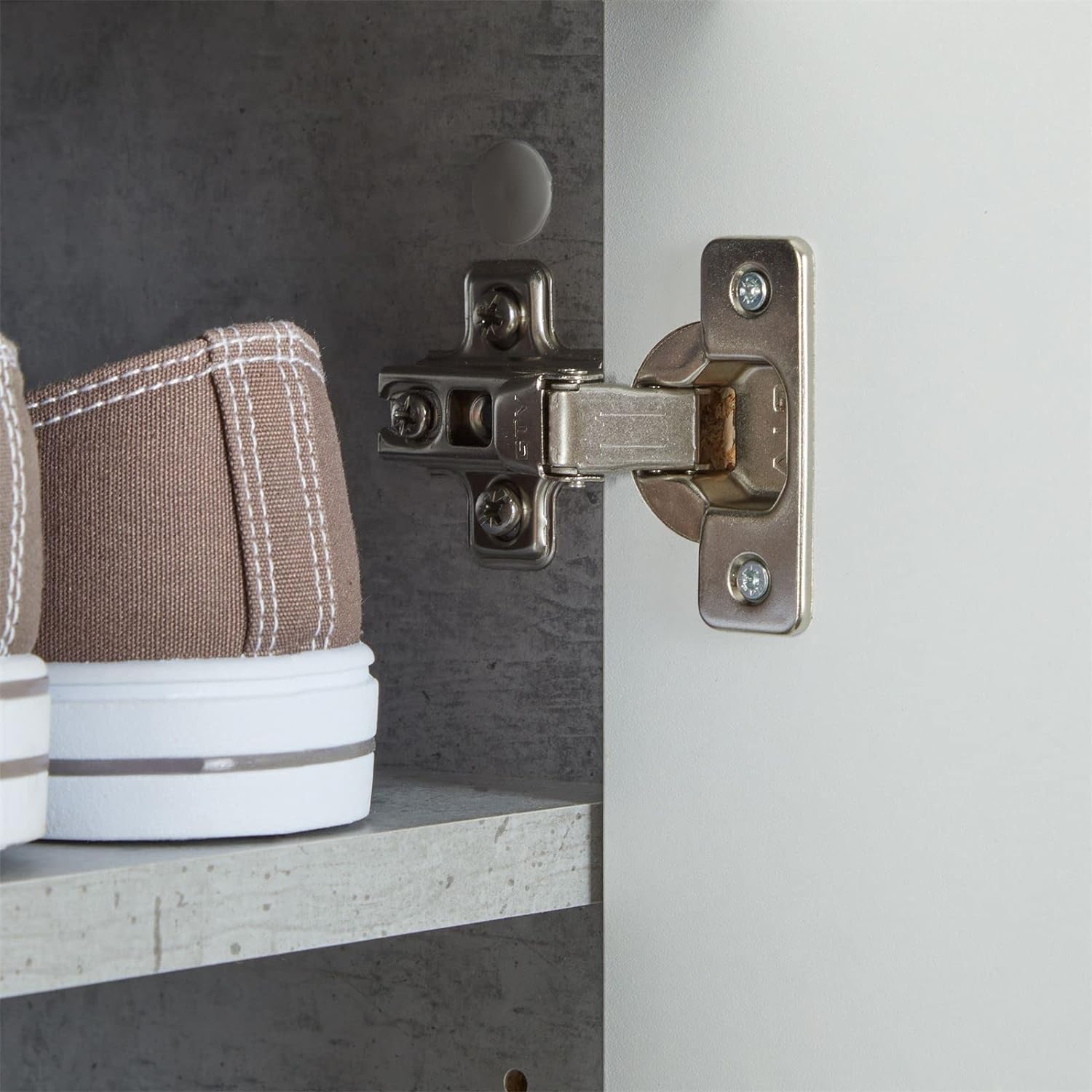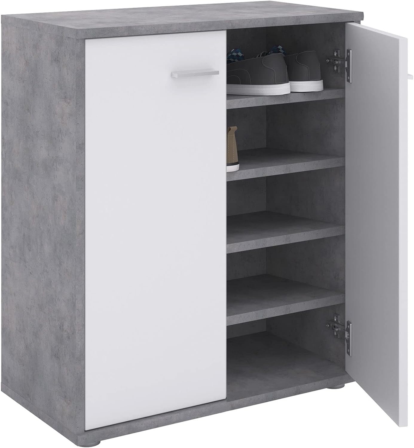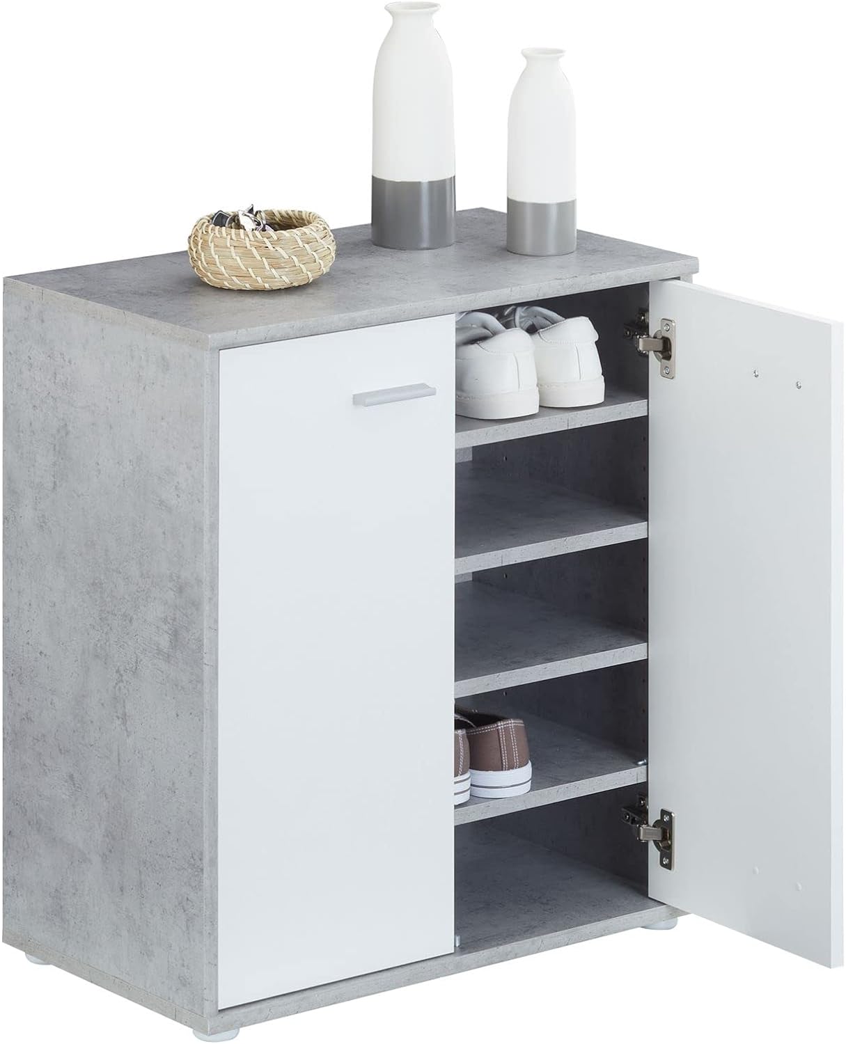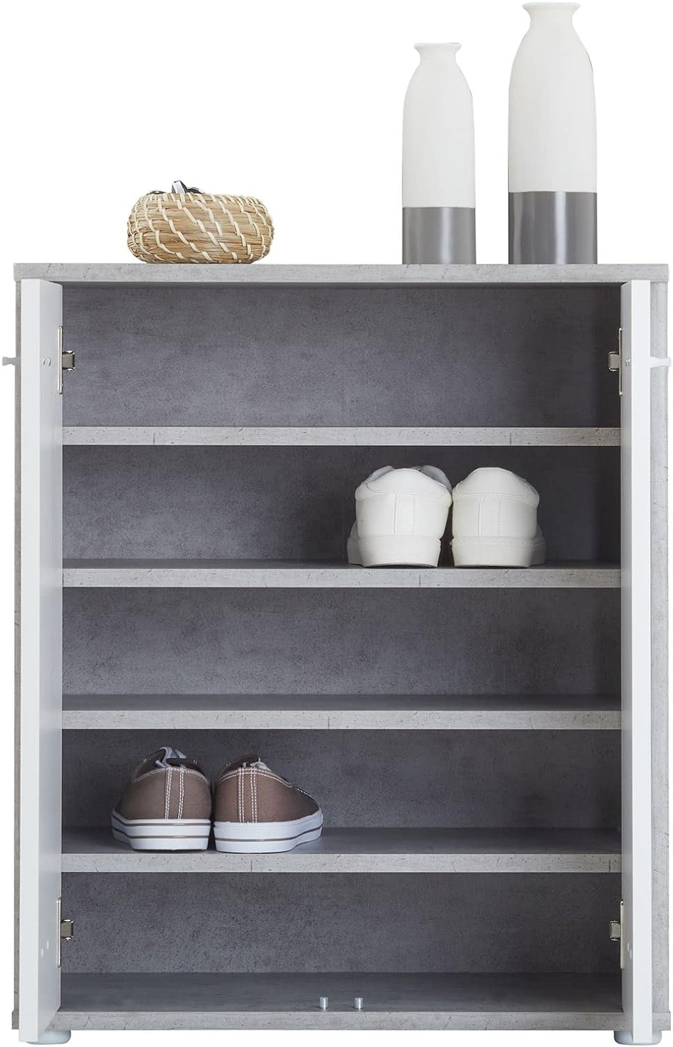 - Hinter den 2 Türen verbergen sich 4 Einlegeböden, welche variabel einsetzbar sind und genügend Platz zum Verstauen Ihrer Schuhe bringen