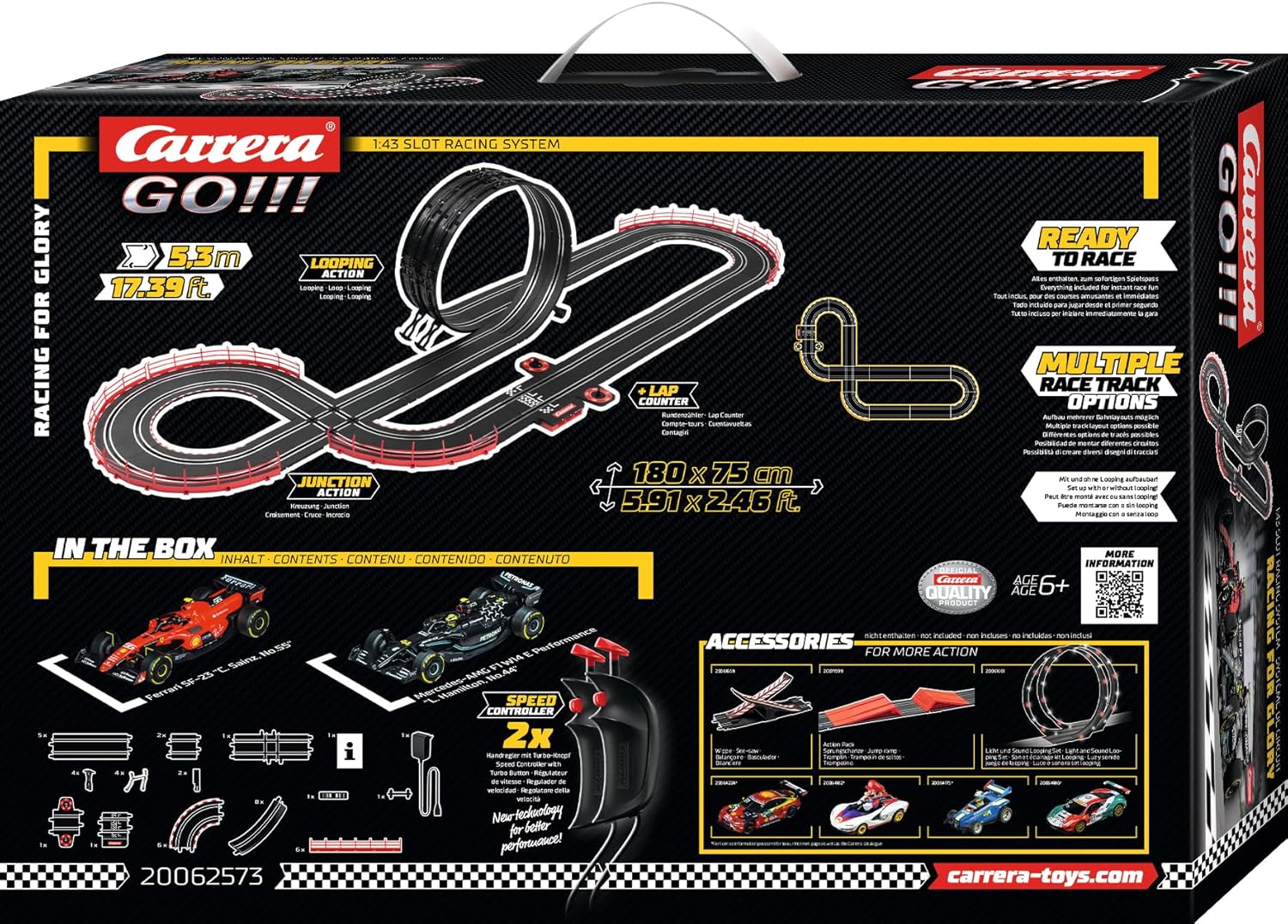 - FORMEL-1 RENNSPAss DER EXTRAKLASSE: Das Carrera GO!!! Set "Racing for Glory" verspricht Formel-1 Rennspass der Extraklasse im eigenen Wohnzimmer. Treten Sie in die Fussstapfen von Formel-1-Legende Lewis Hamilton und dem aufstrebenden Talent Carlos Sainz.