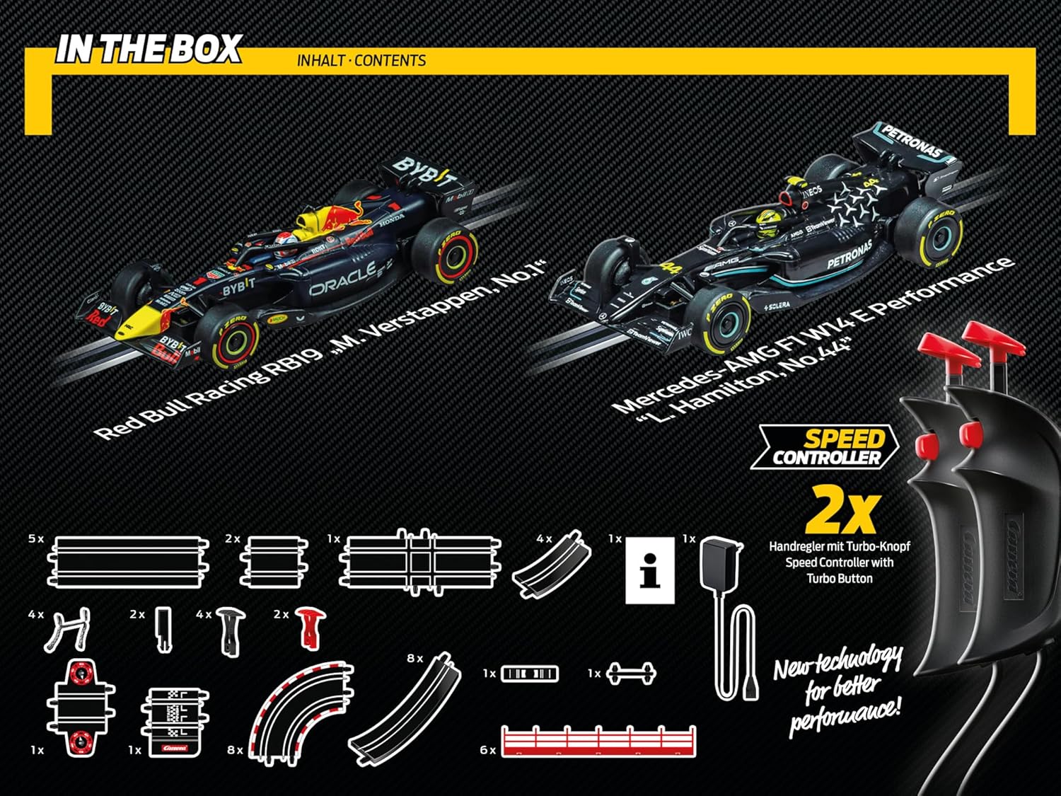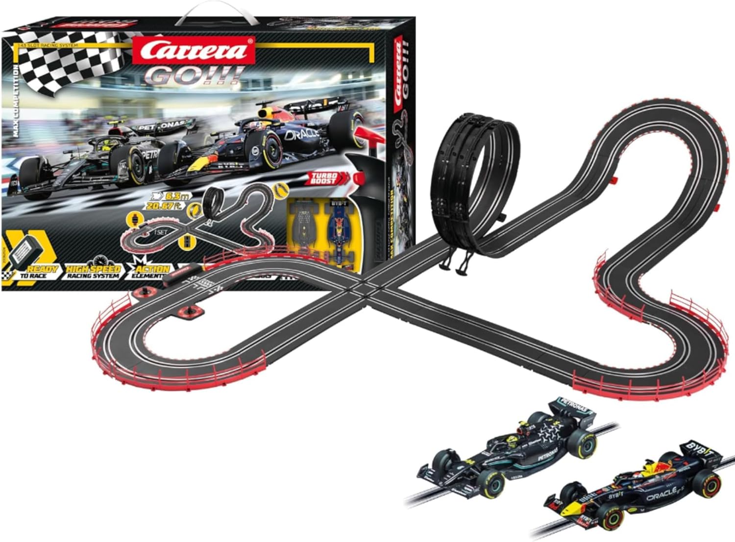 - FORMEL-1-STIMMUNG MIT HOCHGESCHWINDIGKEITSRENNEN: Das Carrera GO!!! Set "Max Competition" versetzt Rennsportfans in die Welt des Hochgeschwindigkeits-Formel-1-Rennens. Treten Sie in die Fussstapfen von Formel-1-Stars wie Lewis Hamilton und Max Verstappen.