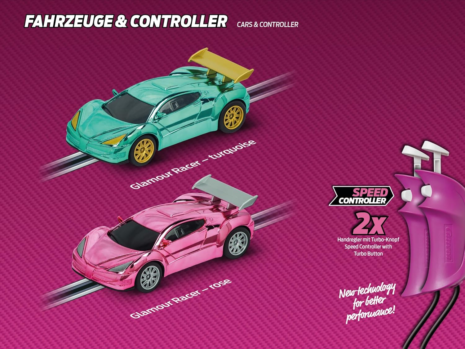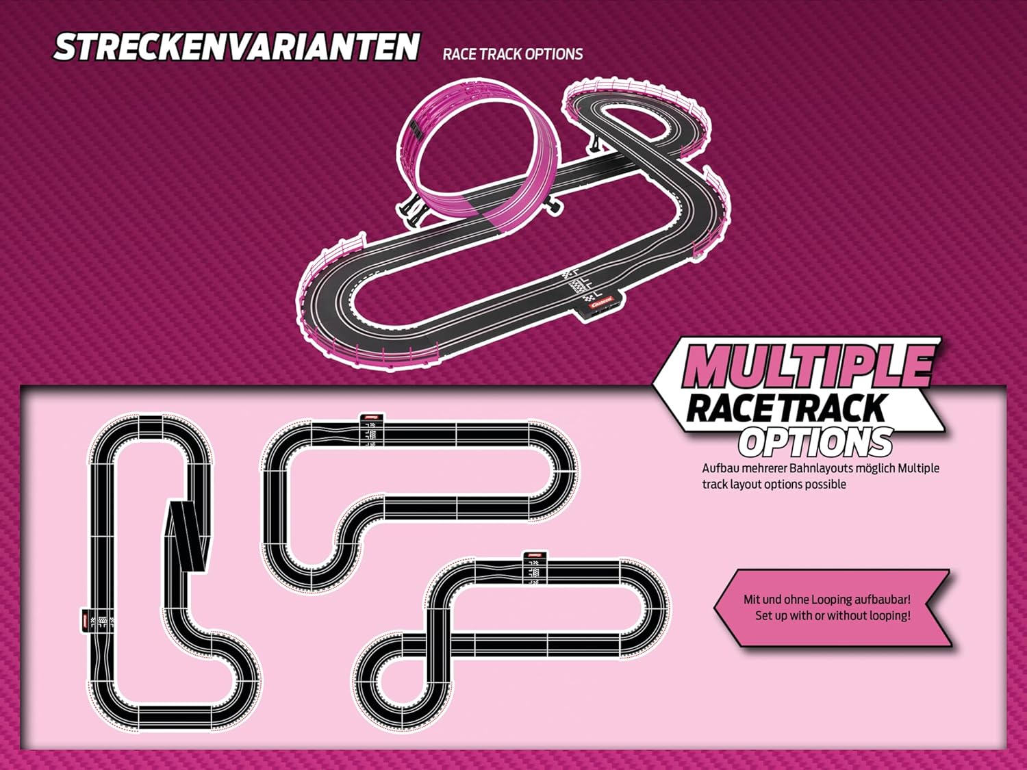 - FARBENFROHER RENNSPAss: Das Carrera GO!!! Set "Pink Action Racing" bringt frischen Farbwind ins Kinderzimmer. Die 4,9 Meter lange Rennstrecke ist mit pinken Akzenten gestaltet, von den Leitplanken bis zu den Handreglern.