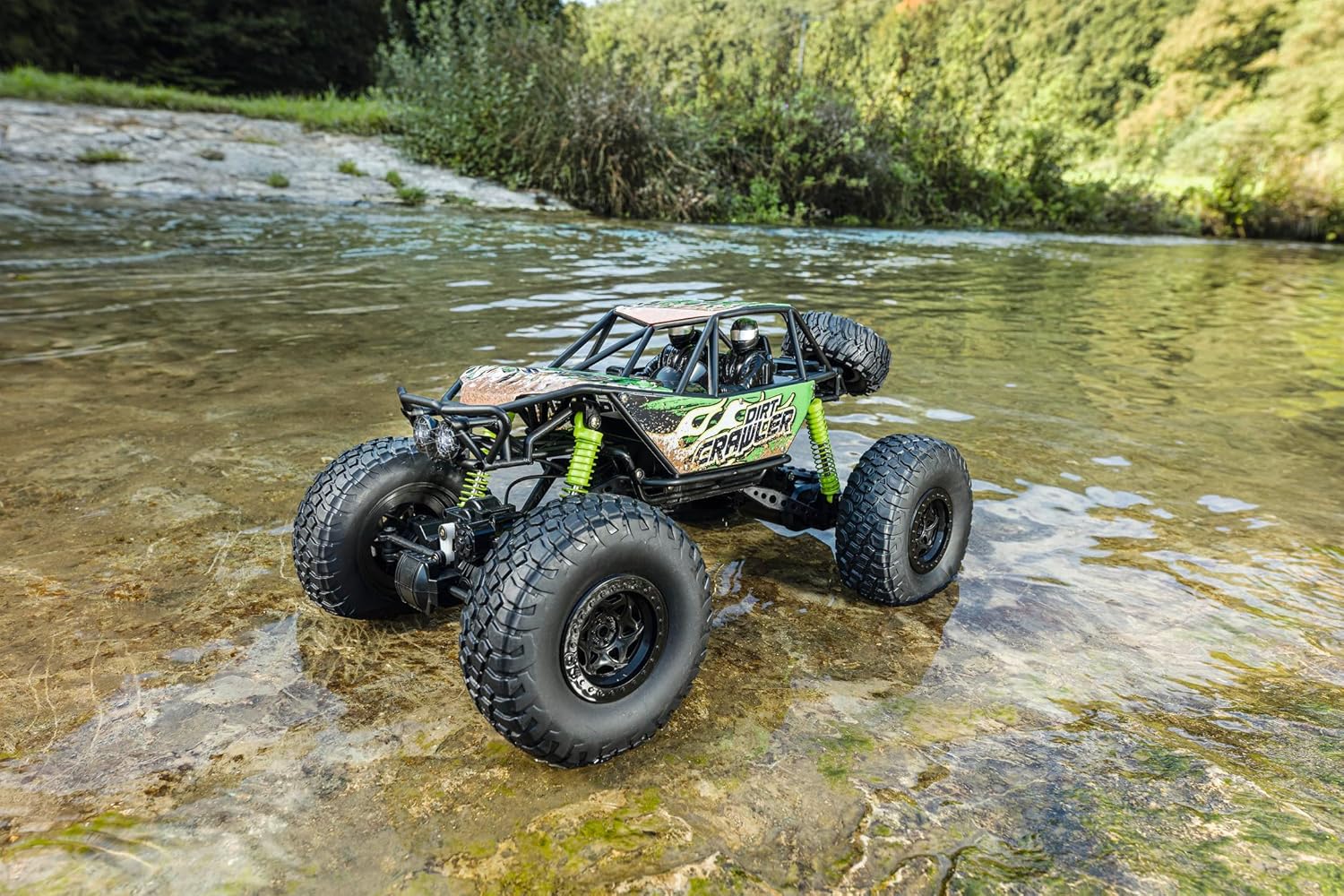 - Extrem geländegängig – Dank 4WD-Allradantrieb und besonders flexiblen Radachsen meistert das Fahrzeug fast jedes Hindernis und bleibt auch bei unebenem Gelände stabil. Die speziellen Offroad-Reifen bieten zusätzlichen Grip, sodass selbst schwierige