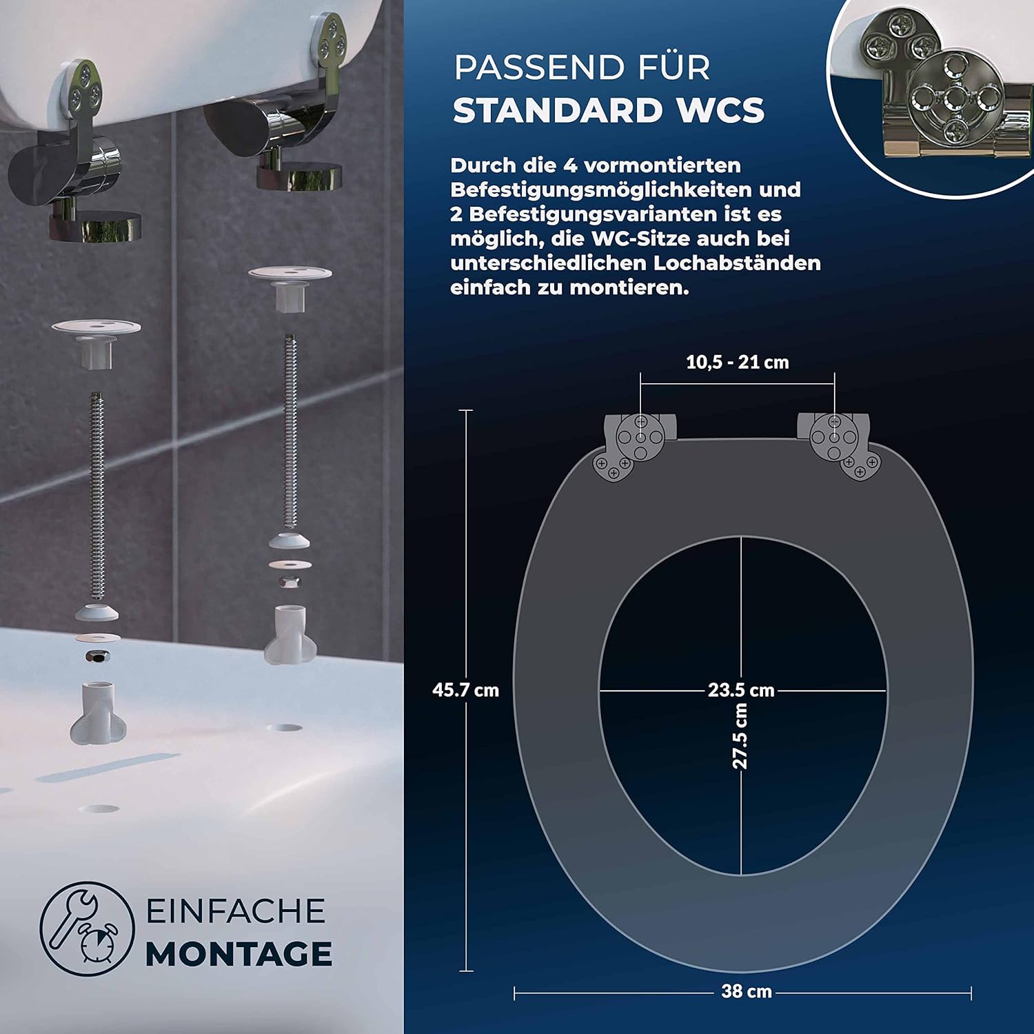 - STABIL: Der Toilettendeckel besteht aus einem stabilen Holzkern. Die rostfreien Metallscharniere sorgen, dank sicherer 3-Punkt-Fixierung, für extra festen Sitz des Deckels. Zudem lässt sich der Scharnierabstand zwischen 10,5 und 21cm verstellen.
