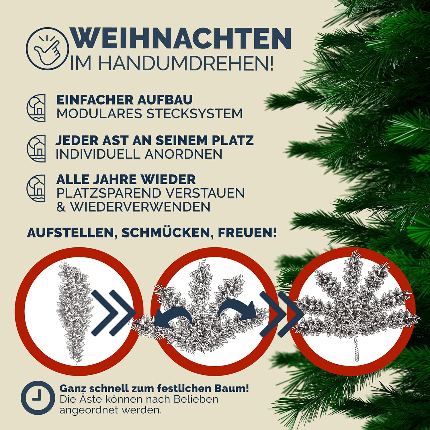 - LEICHTER AUFBAU: Die grüne Tanne lässt sich einfach aufbauen, da du lediglich die einzelnen Teile zusammenstecken musst. Anschliessend kannst du die naturgetreuen Äste, mit insgesamt 533 Spitzen, etwas auffächern, wodurch den Christbaum noch mehr