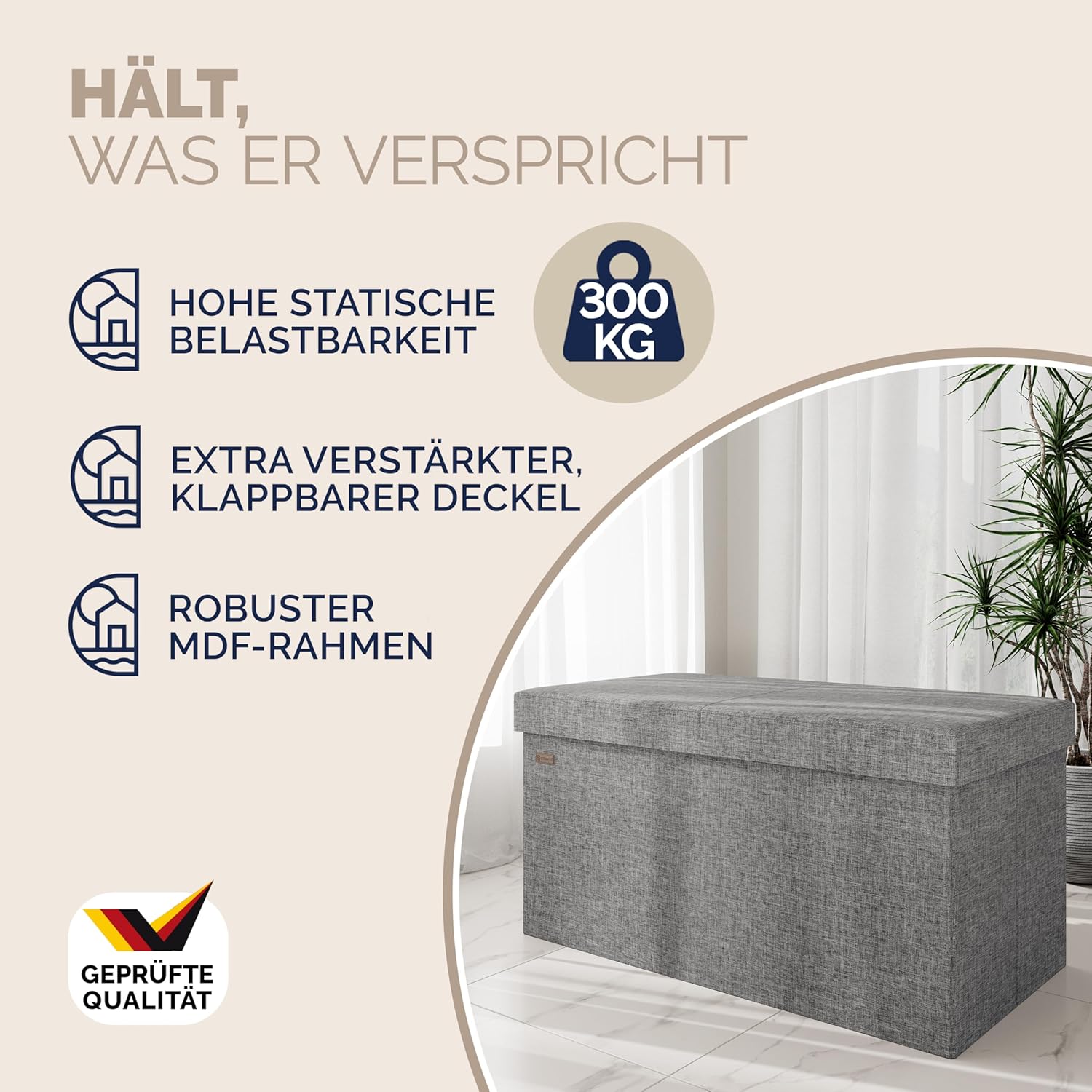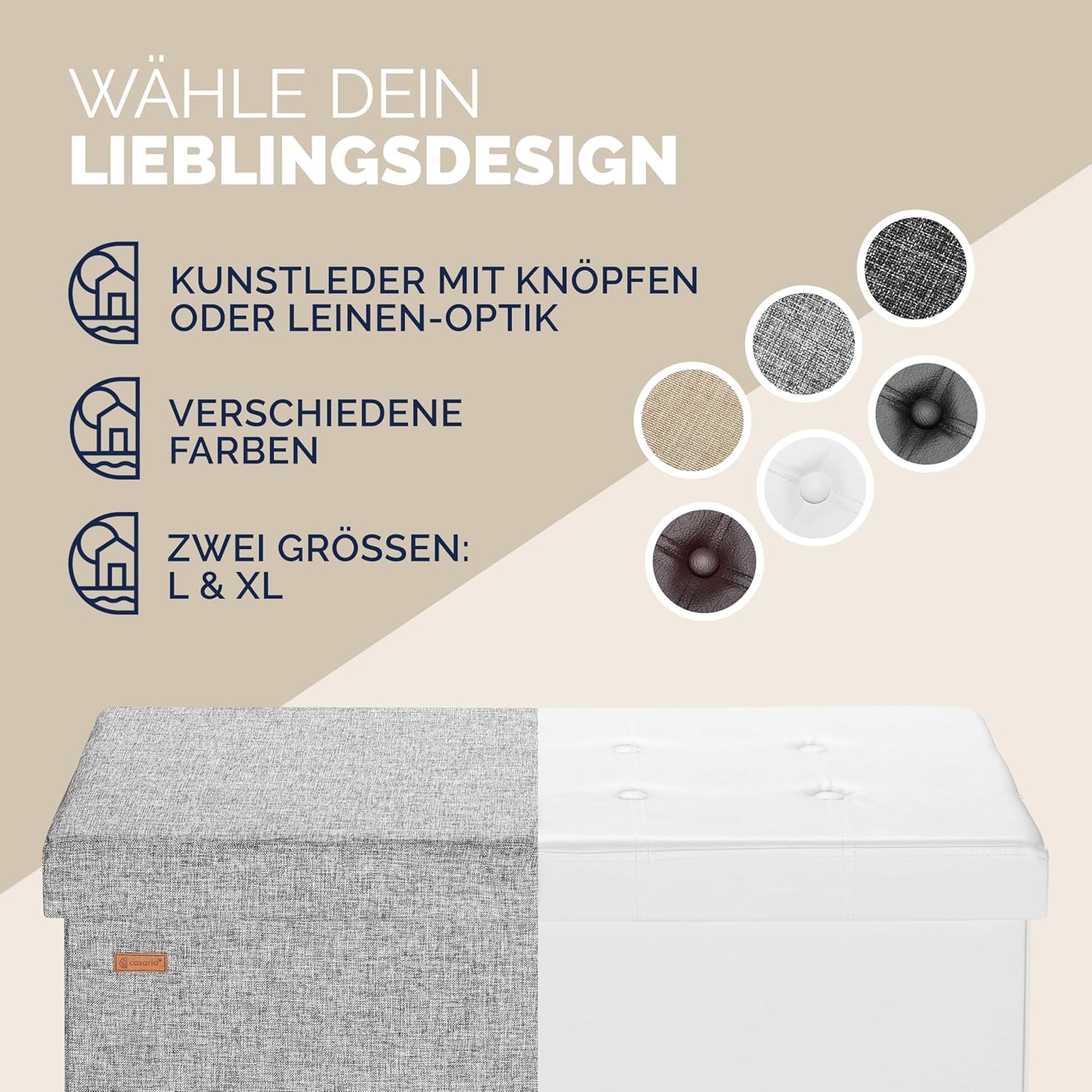 - KLAPPBARER DECKEL: Die moderne Sitzbank mit Stauraum, in Leinen-Optik von CASARIA, wird dich begeistern. Dank des zeitlosen Stils passt die Truhenbank hervorragend in jeden Wohnbereich, egal ob Schlafzimmer oder im Flur. Schaffe stilvoll Ordnung in