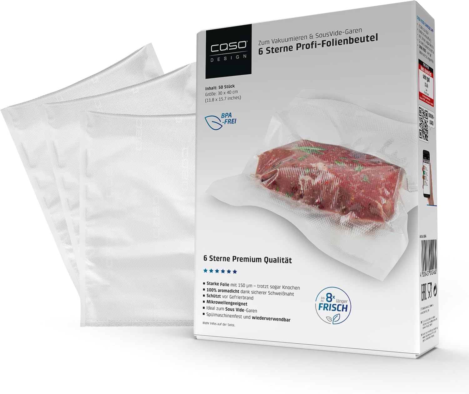 - Bares sparen: Kochen Sie gross und portionieren Sie klein – das spart Zeit und Geld: Nutzen Sie Angebote aus und portionieren und vakuumieren Sie Ihre Einkäufe mithilfe von Caso Profi-Folien für eine platzsparende Lagerung. CASO Vakuumierbeutel- oder