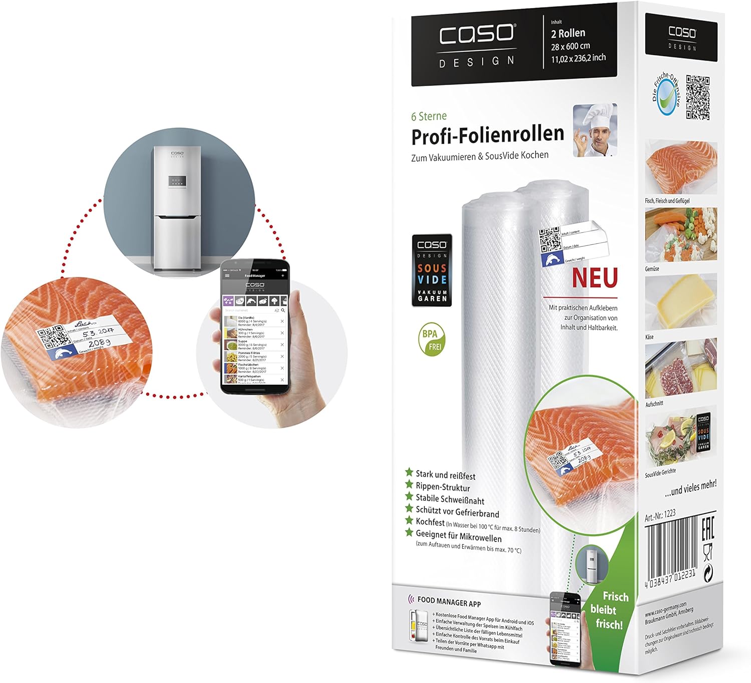 - Produkt 2: Vielseitig einsetzbar: CASO Profi-Folien sind wiederverwendbar (spülmaschinenfest), kochfest und für die Mikrowelle geeignet. Auch für Sous Vide „unter Vakuum“ garen eignen Sie sich die CASO Vakuumierfolien ideal - kochen Sie wie ein Gourmet Koch.