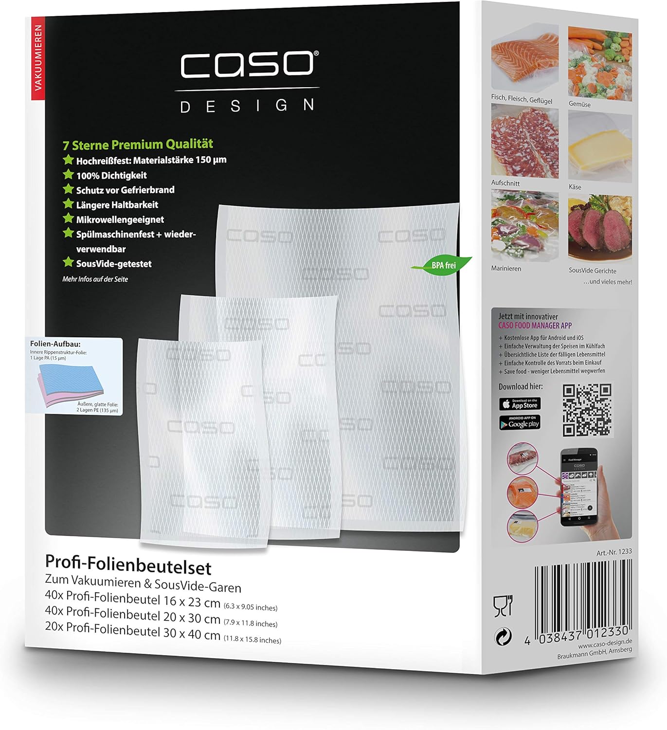- Produkt 2: Vielseitig einsetzbar: CASO Profi-Folien sind wiederverwendbar (spülmaschinenfest), kochfest und für die Mikrowelle geeignet. Auch für Sous Vide „unter Vakuum“ garen eignen Sie sich die CASO Vakuumierfolien ideal - kochen Sie wie ein