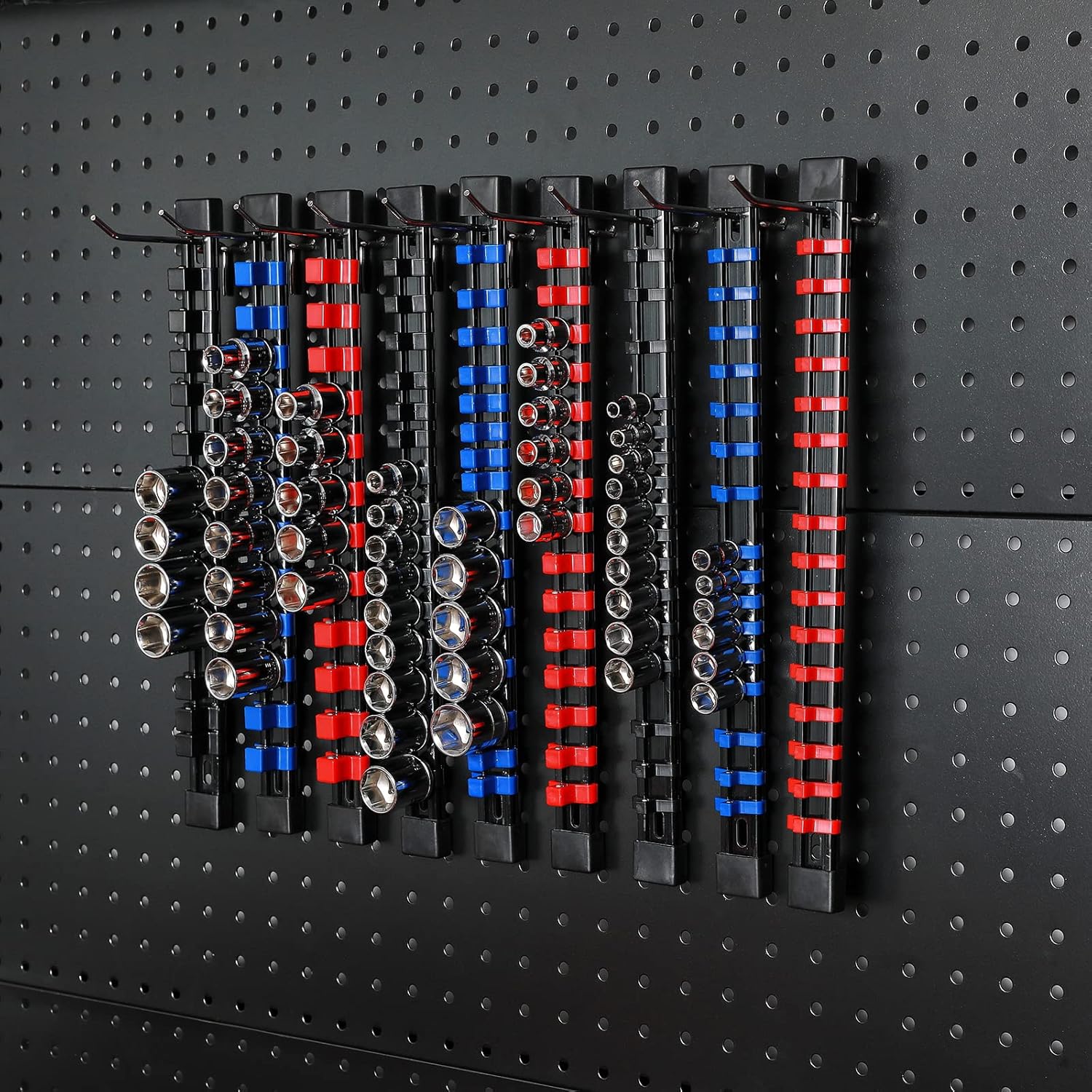 - Holds up to 174 sockets in three color: Blue: 16 x 1/4" Dr. clips, 30x 3/8”Dr. clips, 12 x 1/2" Dr. clips; Red: 16 x 1/4" Dr. clips, 30x 3/8"Dr. clips, 12 x 1/2" Dr. clips; Black: 16 x 1/4" Dr. clips, 30x 3/8"Dr. clips, 12 x 1/2" Dr. clips.