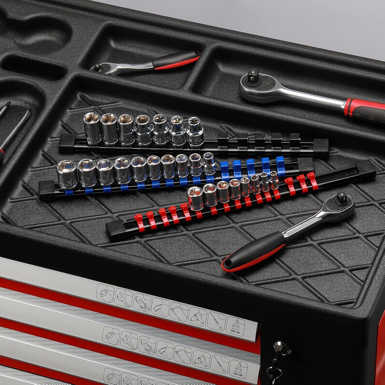 - Organize your toolbox, mount on a wall vertically or horizontally, set it on your workbench, or store it in a drawer; 1/4-inch, 3/8-inch, 1/2-inch driver socket.