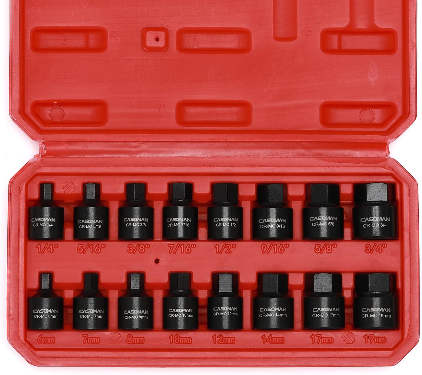- Set include:(SAE)1/4", 5/16", 3/8", 7/16", 1/2", 9/16", 5/8", 3/4";(Metric)6mm, 7mm, 8mm, 10mm, 12mm, 14mm, 17mm, 19mm