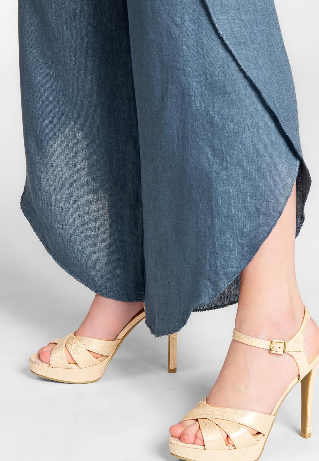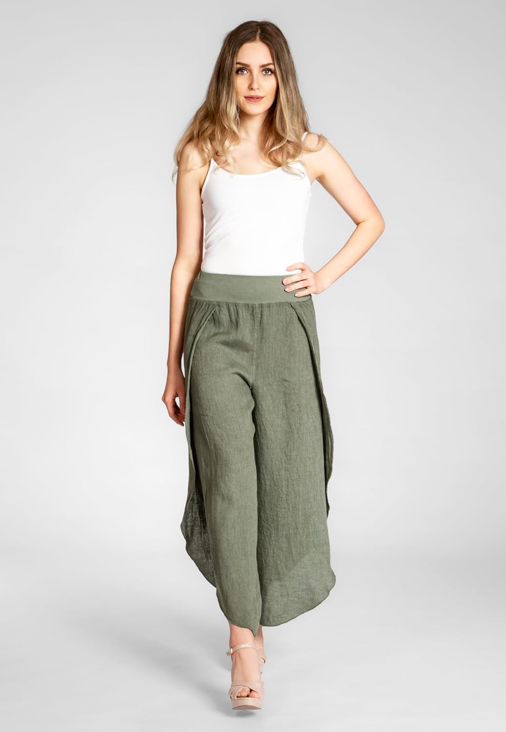 PRODUKTBESCHREIBUNGEN Bezaubernde leichte elegante Damen Sommerhose aus natürlichem Leinenstoff mit breitem Stretch Bund. Ein Hauch von Nichts, trotzdem elegant und blickdicht. Die Sommerhose die Sie kaum spüren, trotzdem stylish und elegant. Der hohe Stretch Bund mit extra weichem, bequemen Gummizug sorgt für die optimale Passform. Der Stoff ist an den Beinen mit einem leicht schräg verlaufenden Saum übereinandergelegt und überschneidet sich leicht. Die Beine am unteren Saum sind von Aussen nach Innen angeschrägt. Der luftig leichte, sehr angenehm zu tragende Stoff besteht ausnatürlichem Leinen. Material: 100% Leinen. Pflegehinweis: Maschinenwäsche bei 30°C. Caspar - Made in Italy. Mehr