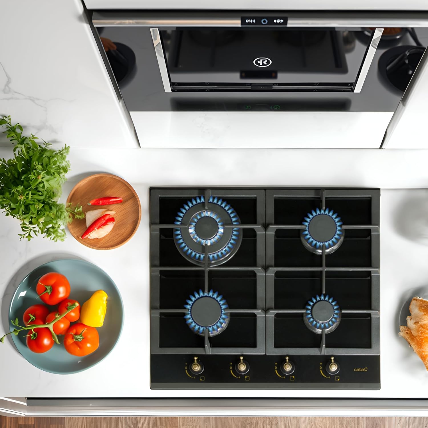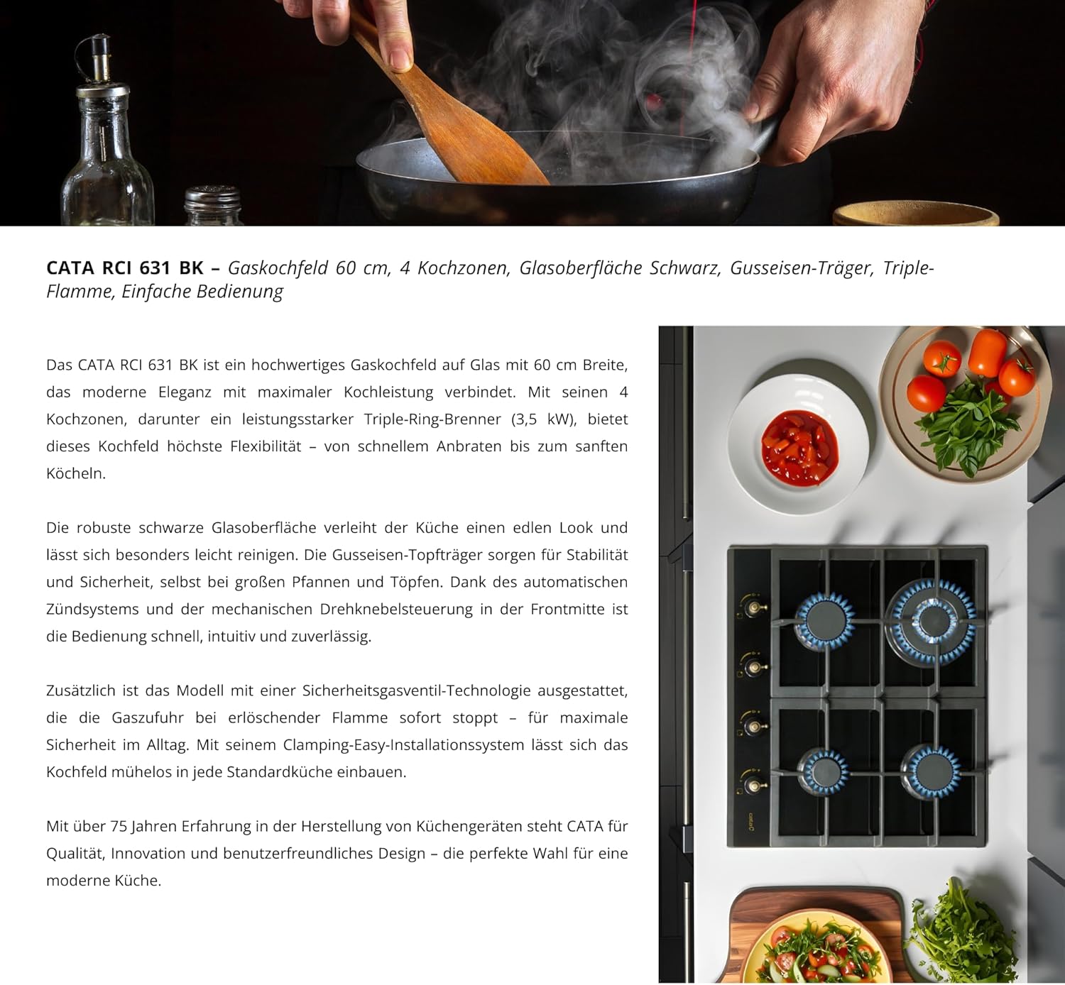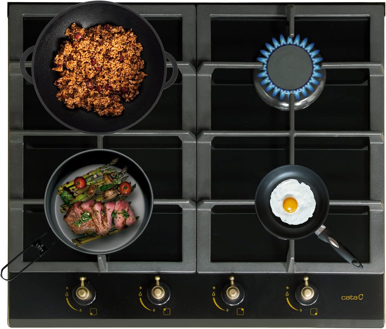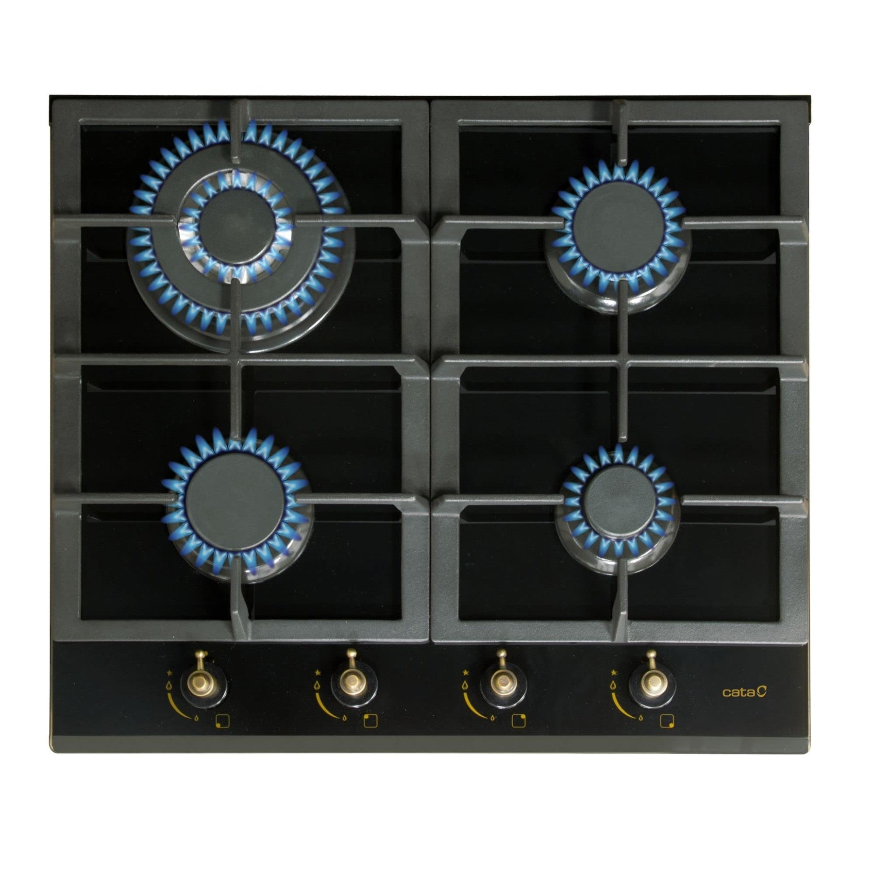- 4 GASKOCHFELDER: Unser Gaskochfeld ist 58 cm breit und enthält eine elektronische Zündsteuerung für 4 unabhängige Gasflammen mit einer Gesamtleistung von 8 kW. Zwei von ihnen sind halbschnell, eins ist komplementär und eins mit dreifacher Krone.