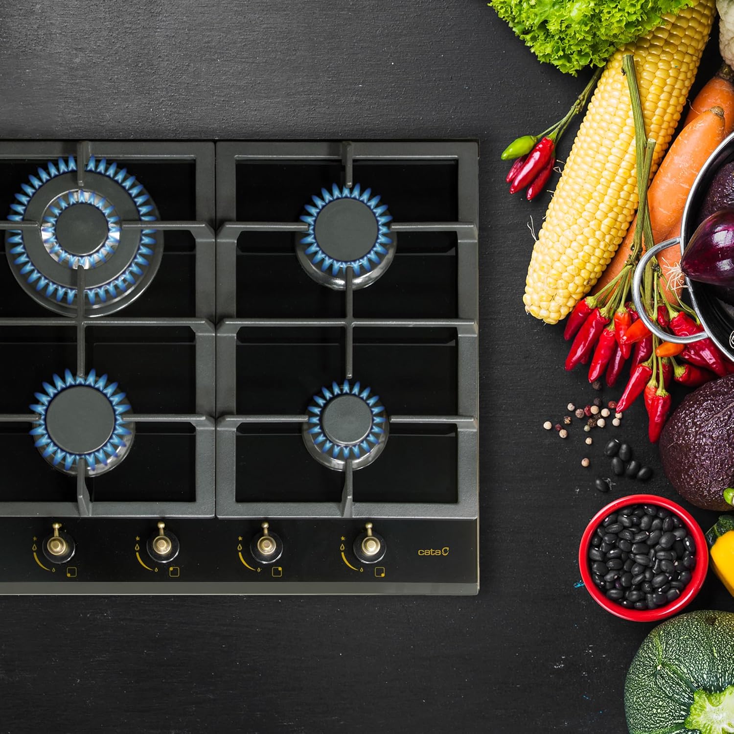 - BRENNER UND GRILLS AUS EISEN: Die schwarze Glasoberfläche mit den Brennern und Gittern aus Eisen verleiht Ihrer Küche einen Hauch von Klasse und Raffinesse. Er hat einen Gaseinlass auf der rechten hinteren Seite mit Ventil für mehr Sicherheit.