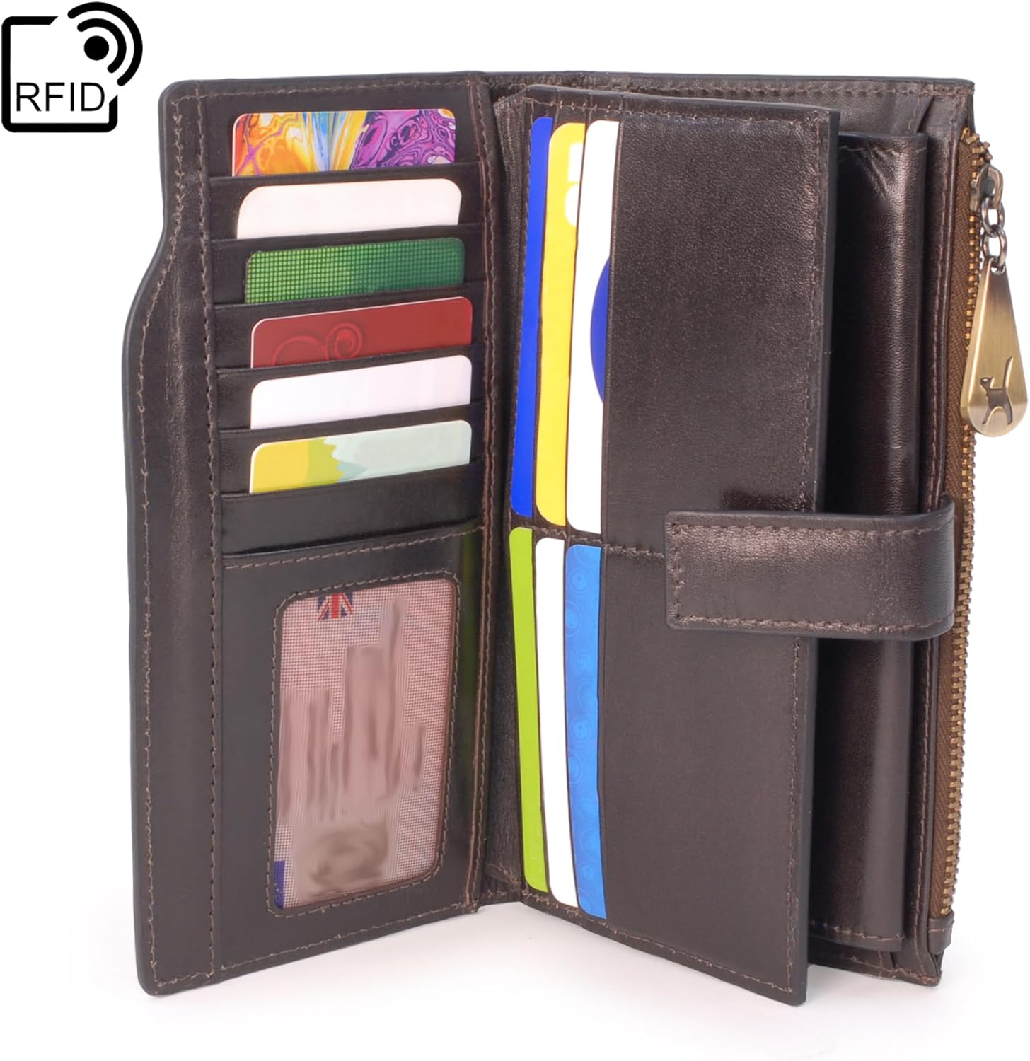 - Diese grosse Lederbörse bietet praktische Organisation mit speziellen Fächern für Karten, Scheine, Münzen und ein Smartphone. Ein strukturiertes Layout und ein sicheres Reissverschlussfach sorgen dafür, dass der Inhalt ordentlich bleibt und leicht