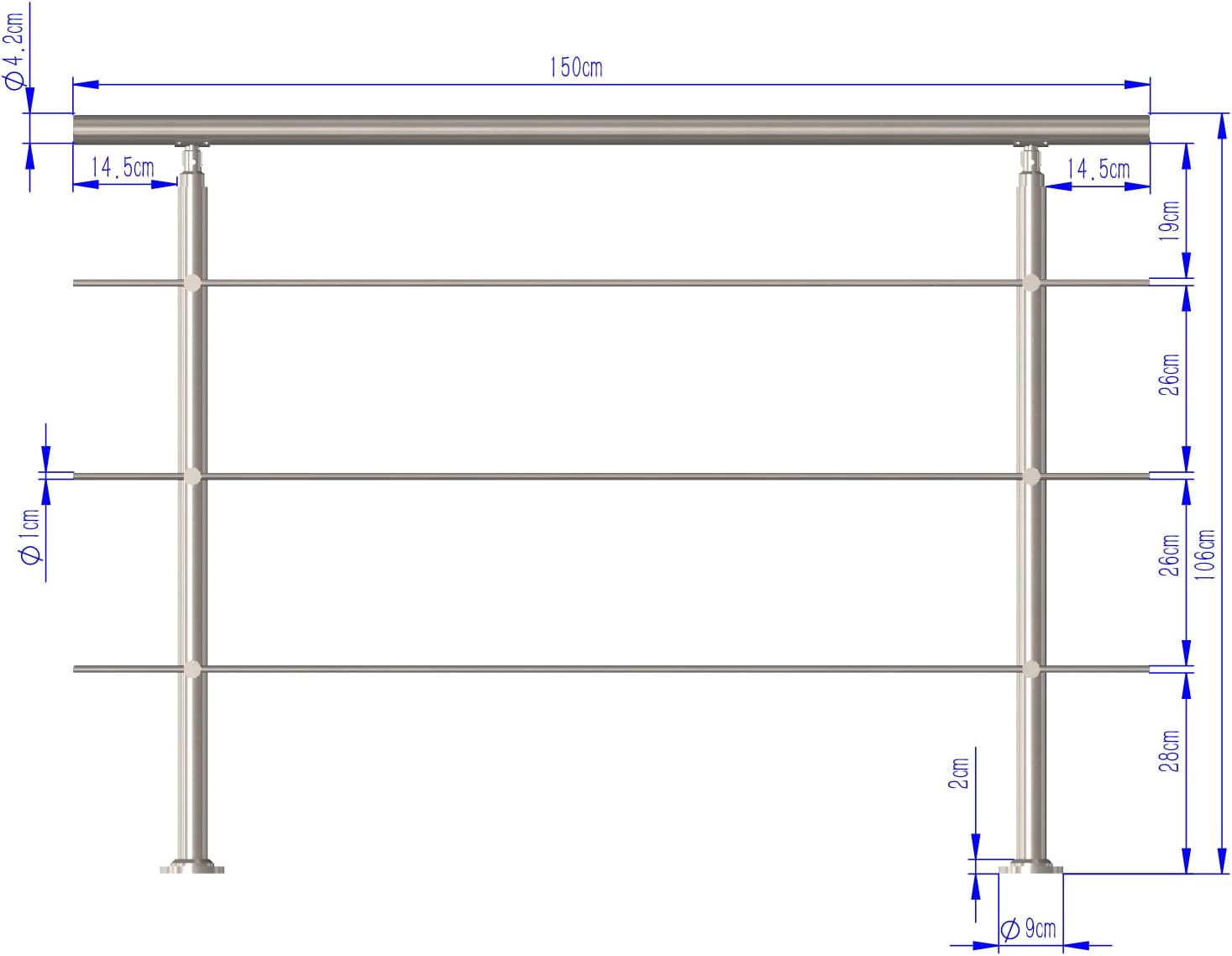 - Geländer Länge: 150 cm, Querstrebe: 2, Höhe: 106 cm, Handlauf und Pfosten: ø42 mm