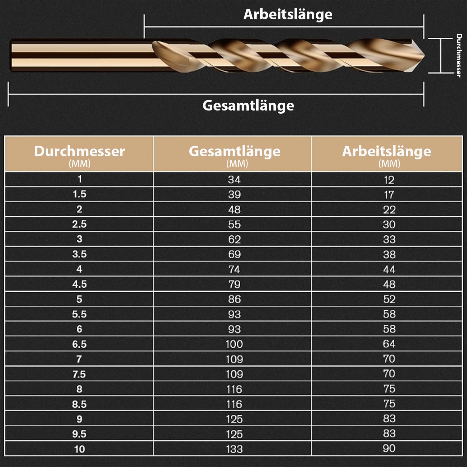 - Metallbohrer-Set: HSS-G Material; 19-teiliges Set, 1–10 mm, 0,5 mm Schritte; Geschliffen nach DIN 338; 135° Teilungspunkt; Doppelspiralflöte