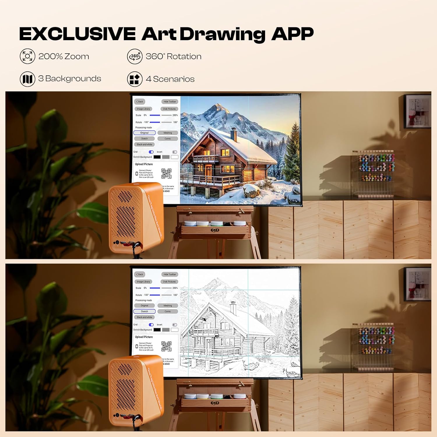 - Exklusive Zeichen-Assistenten-App – Bitte aktualisieren Sie die App auf die neueste Version 1.8 für eine optimale Nutzung. Die integrierte Kunstsoftware bietet Werkzeuge wie flexiblen Zoom, 360°-Drehung und ein 3x3-Raster. Unsere App gestaltet Ihren