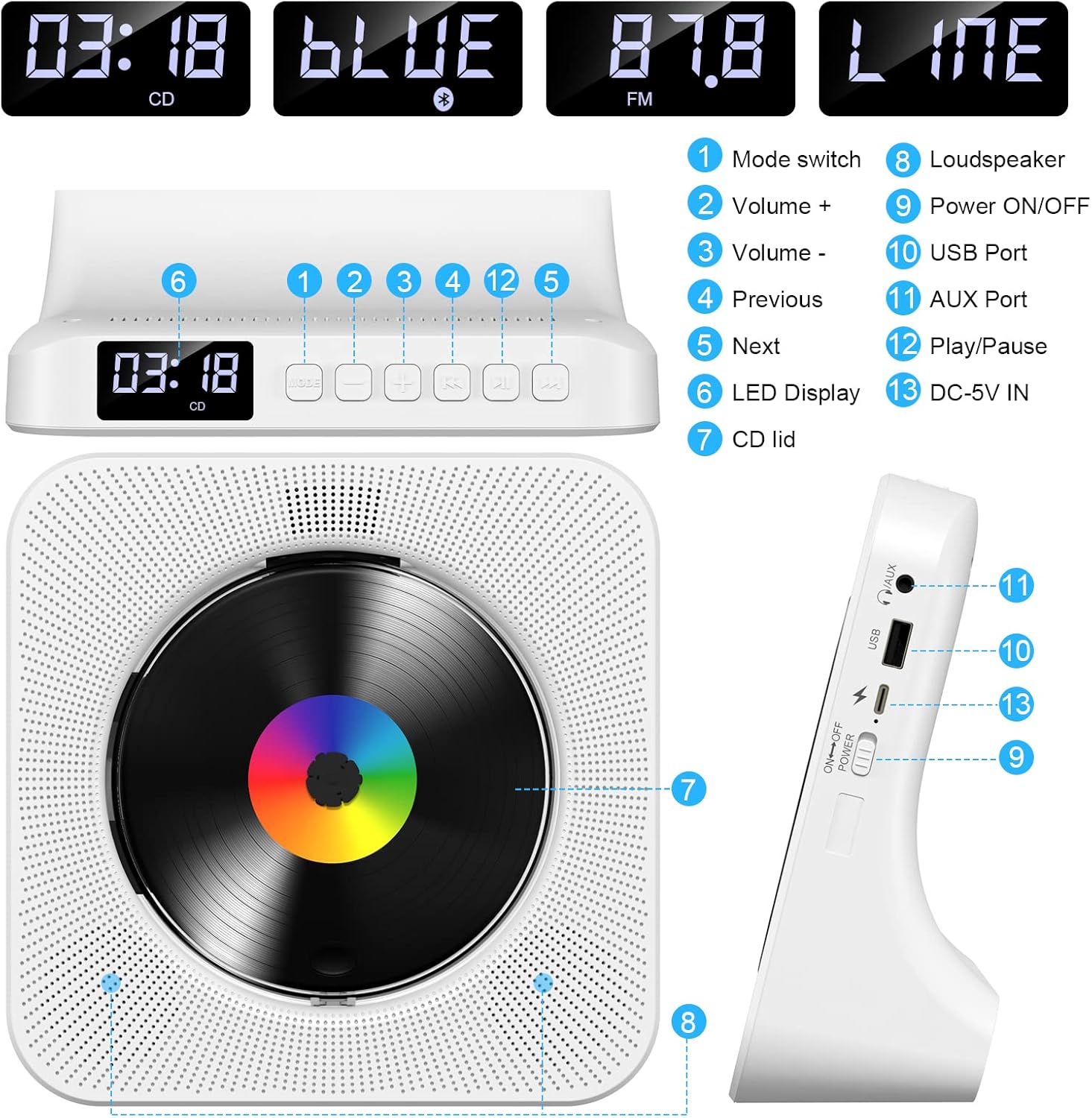 - 6 IN 1 Multifunktions CD-Player: 1. Desktop-CD-Player, 2. Bluetooth 5.0-HiFi-Lautsprecher, 3. UKW-Radio, 4. Musik-Player mit TF-Karte, 5. USB-Flash-Laufwerk-Player, 6. 3,5-mm-Audio-Player. Unterstützt CD, CD-G, MP3, WMA. Der 6-in-1-CD-Player macht Ihr
