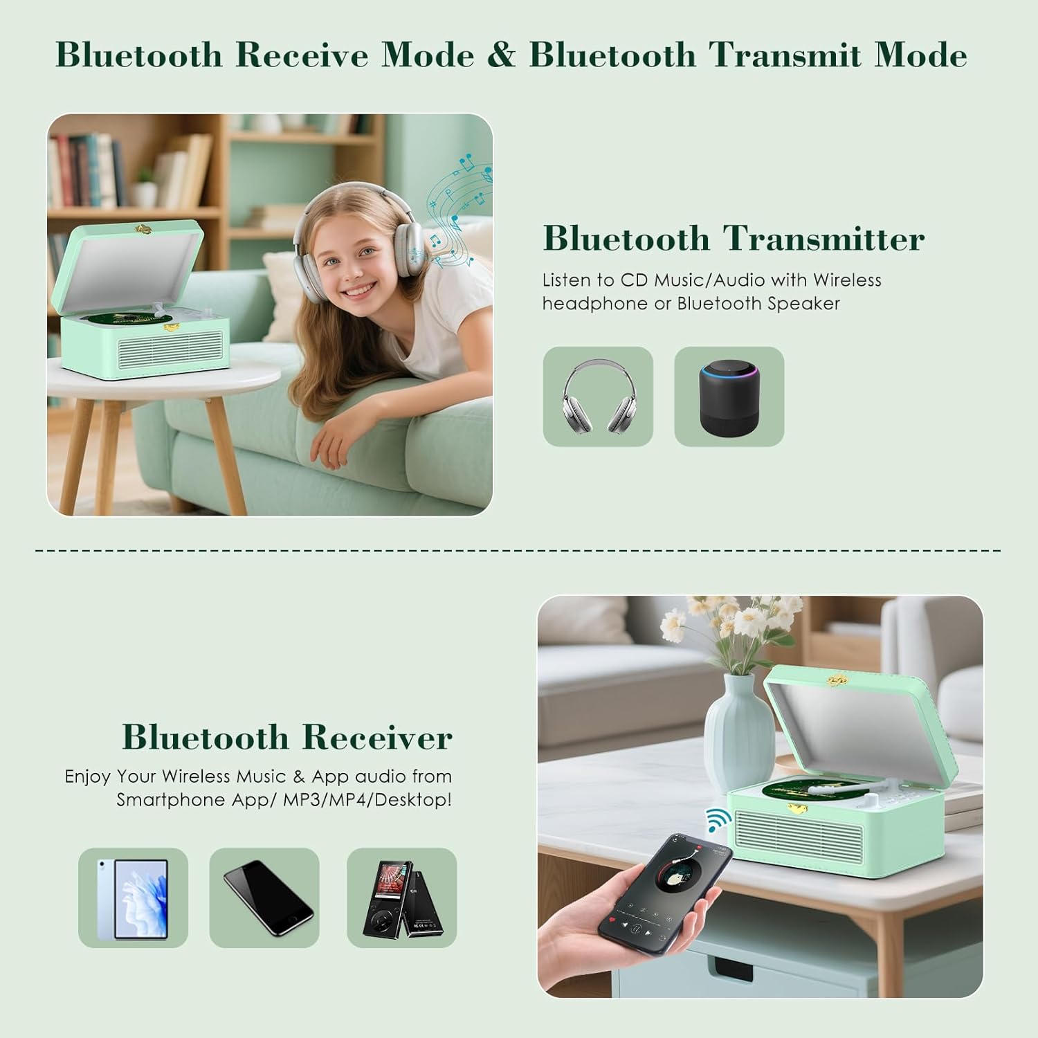 - CD Player mit Bluetooth: Dieser CD-Player verfügt über einen integrierten Bluetooth-Sender und -Empfänger, der nicht nur eine Verbindung zu Bluetooth-Lautsprechern und -Kopfhörern herstellt, sondern auch Bluetooth-Signale von Smartphones, Laptops und