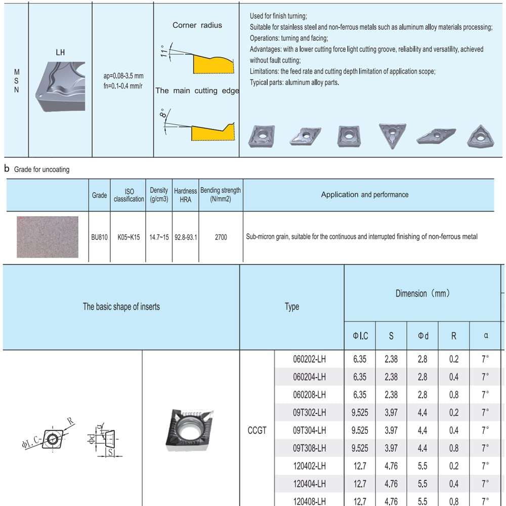 • Der Chipbreaker LH eignet sich für die Fertigbearbeitung von Aluminium, Kupfer und anderen Nichteisenmetallen, die empfohlene Hauptsorte ist BU810.