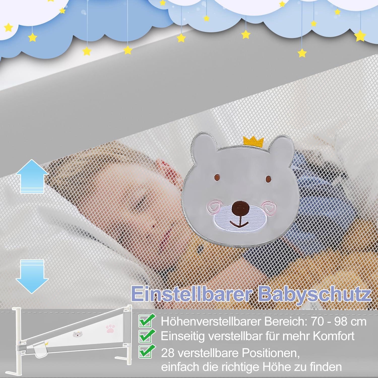 - 【Schützen das Baby】Der Bettgitter ist in 28 Positionen von 70 cm bis 98 cm höhenverstellbar und kann zusätzlich zur Gesamthöhe flexibel auf einer Seite angehoben werden. Sie können die Höhe frei an die Dicke der Matratze anpassen, um Ihr Baby