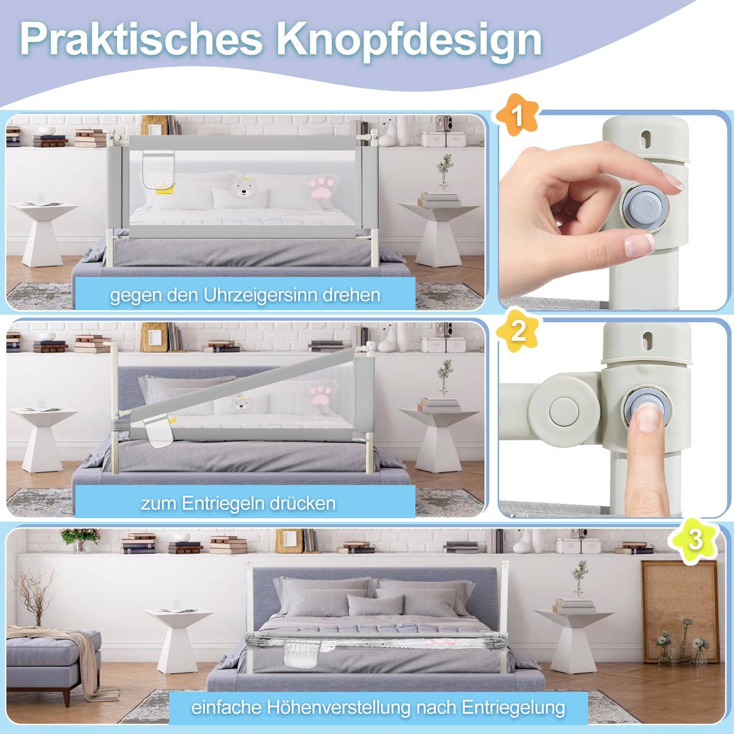 - 【Supersicherer Schutz】Kinderbettgitter hat verstärkte Sicherheitsgelenke für zusätzliche Festigkeit und Stabilität. Und unser Bed Rail für Kleinkinder passt sich nahtlos im 90°-Winkel an die Matratze an, so dass keine Lücken zwischen dem